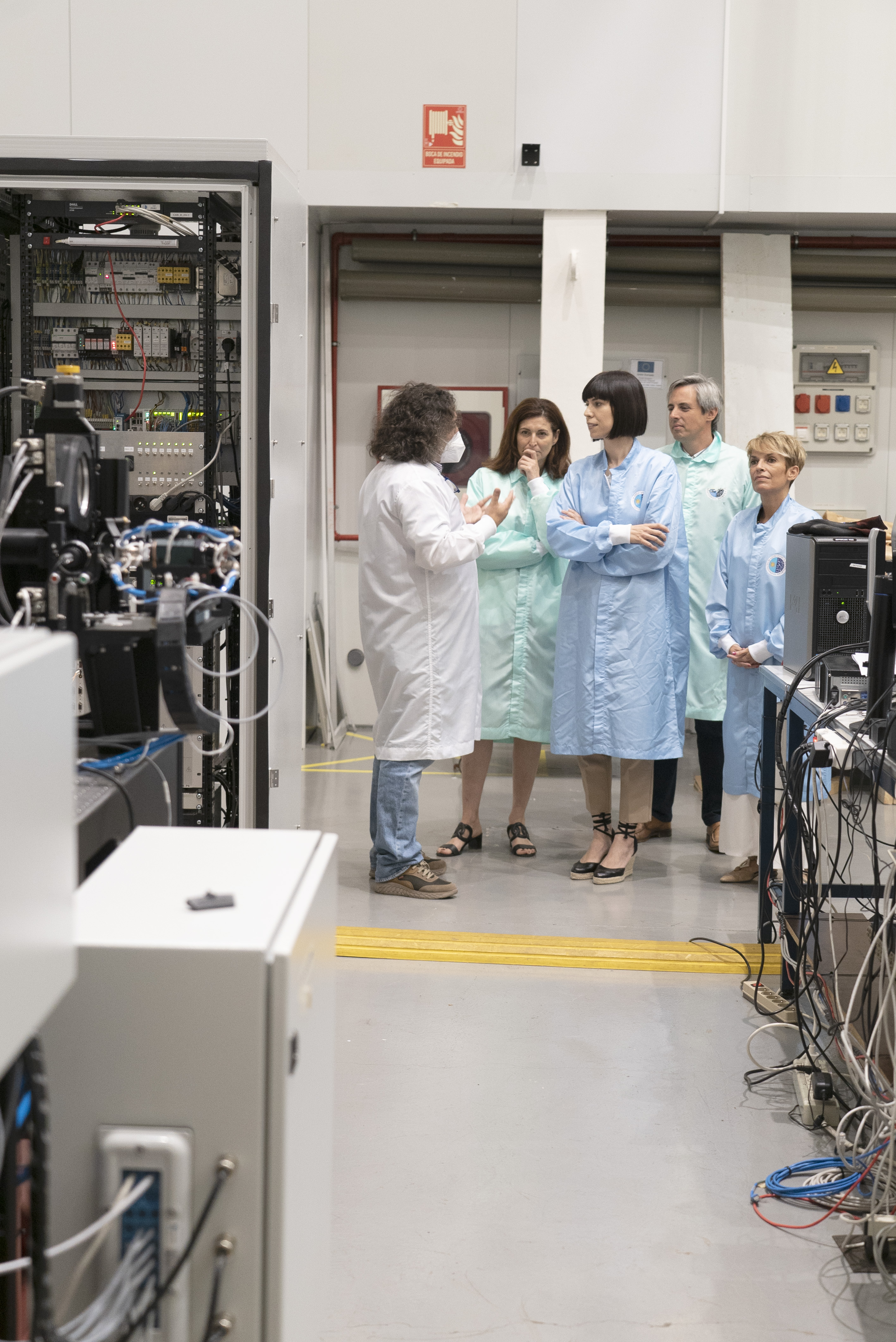 Visit to the instrumentation area facilities. From left to right: Alfonso López Aguerri, Instrumentation Coordinator of the IAC, Raquel Yotti, General Secretary for Research of the Ministry of Science and Innovation, Diana Morant, Minister for Science and Innovation, Carlos Navarro Martínez, Director of the Canary Islands Agency for Research, Innovation and the Information Society, and Elena Máñez, Regional Minister of Economy, Knowledge and Employment of the Government of the Canary Islands. Credit: Inés Bonet.
