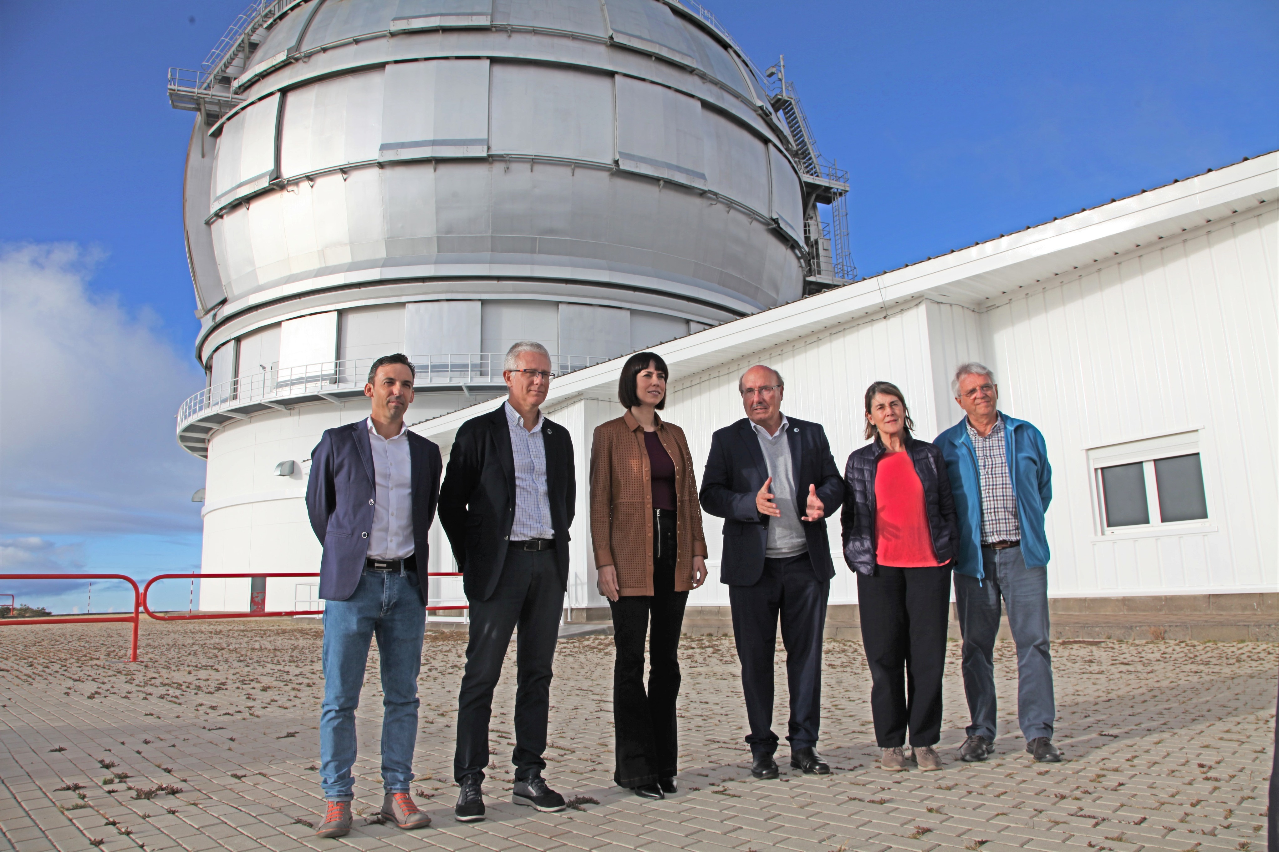 Visit by the Minister for Science and Innovation, Diana Morant. From left to right in the picture, Luis Alberto Rodríguez García, Head of GTC Engineering Operations; Romano Corradi, GTC Director; Diana Morant, Minister of Science and Innovation; Rafael Rebolo, Director of the IAC; Casiana Muñóz-Tuñón, Deputy Director of the IAC; and Juan Carlos Pérez Arencibia, ORM Administrator.