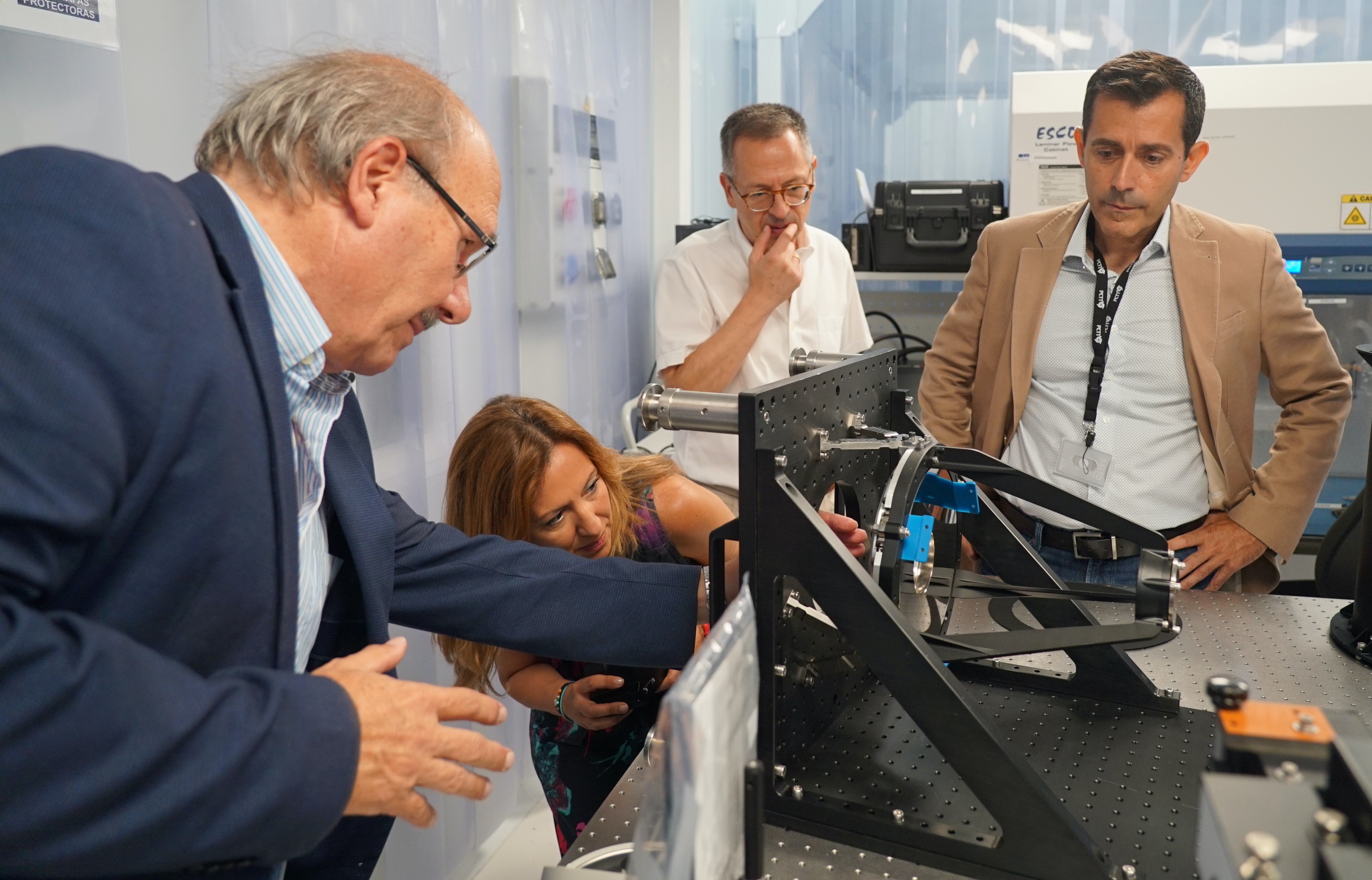 Rosa Dávila, presidenta del Cabildo de Tenerife, y Juan José Martínez, consejero de Innovación, Investigación y Desarrollo, visitaron las salas limpias donde se desarrolla la tecnología espacial en el edificio de IACTEC. En la imagen, de izquierda a derecha: Rafael Rebolo, director del IAC, Rosa Dávila, presidenta del Cabildo de Tenerife, Alex Oscoz, investigador principal de IACTEC-Espacio; y Juan José Martínez, consejero de Innovación, Investigación y Desarrollo. Crédito: Alejandra Rueda (IAC).