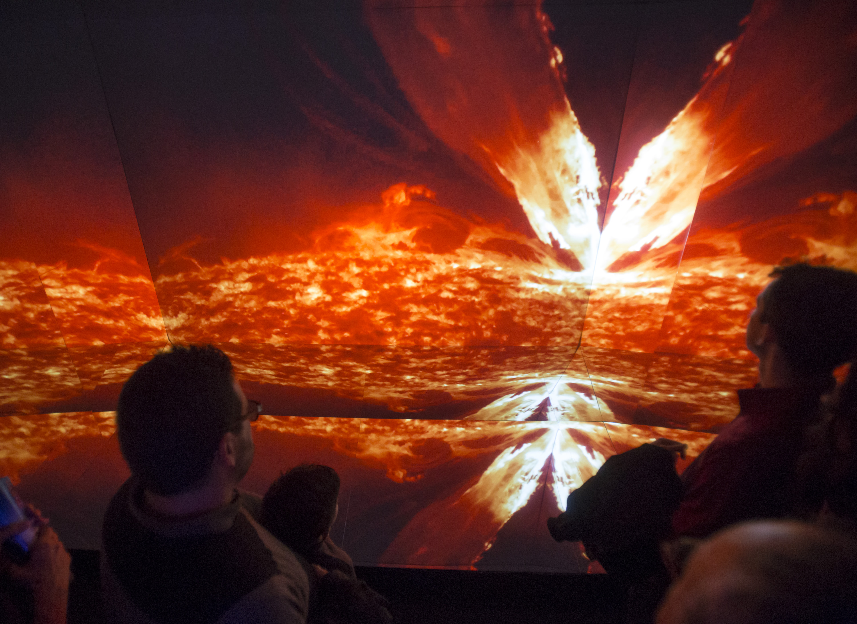 Visitors to the "Lights of the Universe" exhibition in front of the "Kaleidoscope of the GTC" module where visitors can experience wraparound images. Credits: Daniel López / IAC