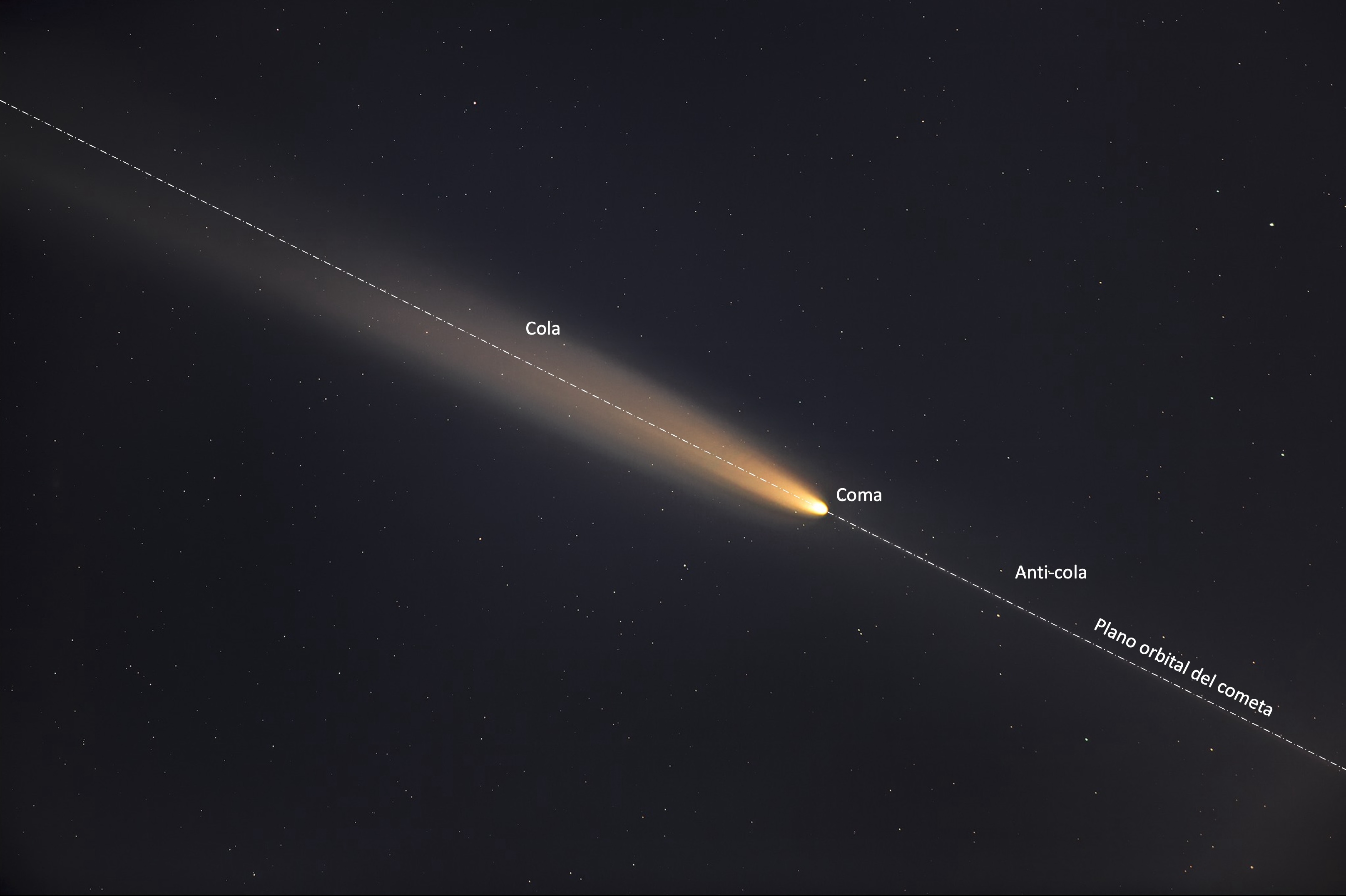 La anticola es parte de la cola de polvo del cometa que parece apuntar hacia el Sol. Se trata de una ilusión óptica que se acentúa cuando la Tierra cruza el plano de la órbita del cometa, especialmente cuando éste está cerca del Sol, como es el caso del C/2023 A3. El polvo del cometa, especialmente el material más pesado, va quedando en una delgada lámina que es soplado lentamente por el viento solar, quedando por detrás del cometa, dando lugar así a esta denominada anticola. La anticola del cometa C/2023 A3 resultó extremadamente bien definida, seguramente un rasgo diferenciador de este cometa que permanecerá en nuestra memoria.