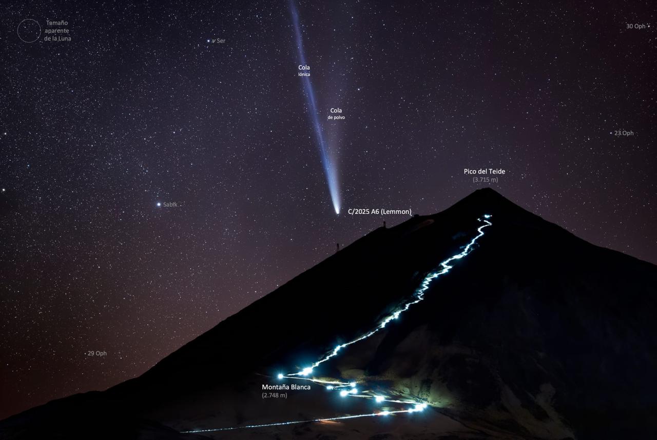 Foto 13: Imagen del cometa C/2025 A6 (Lemmon) tras el Teide, obtenida el 10 de noviembre de 2025 tras la puesta de Sol desde el Observatorio del Teide (isla de Tenerife, Canarias). Se trata de una composición de 110 imágenes de 6 segundos de exposición para cada una (3.200 ISO) con una cámara réflex digital con objetivo de 135 mm f2 con seguimiento estelar y posteriores 457 imágenes en total del paisaje sin seguimiento estelar para el fondo (Teide y montañeros). Daniel López y Alfred Rosenberg / IAC.