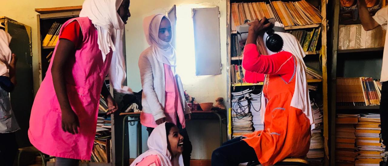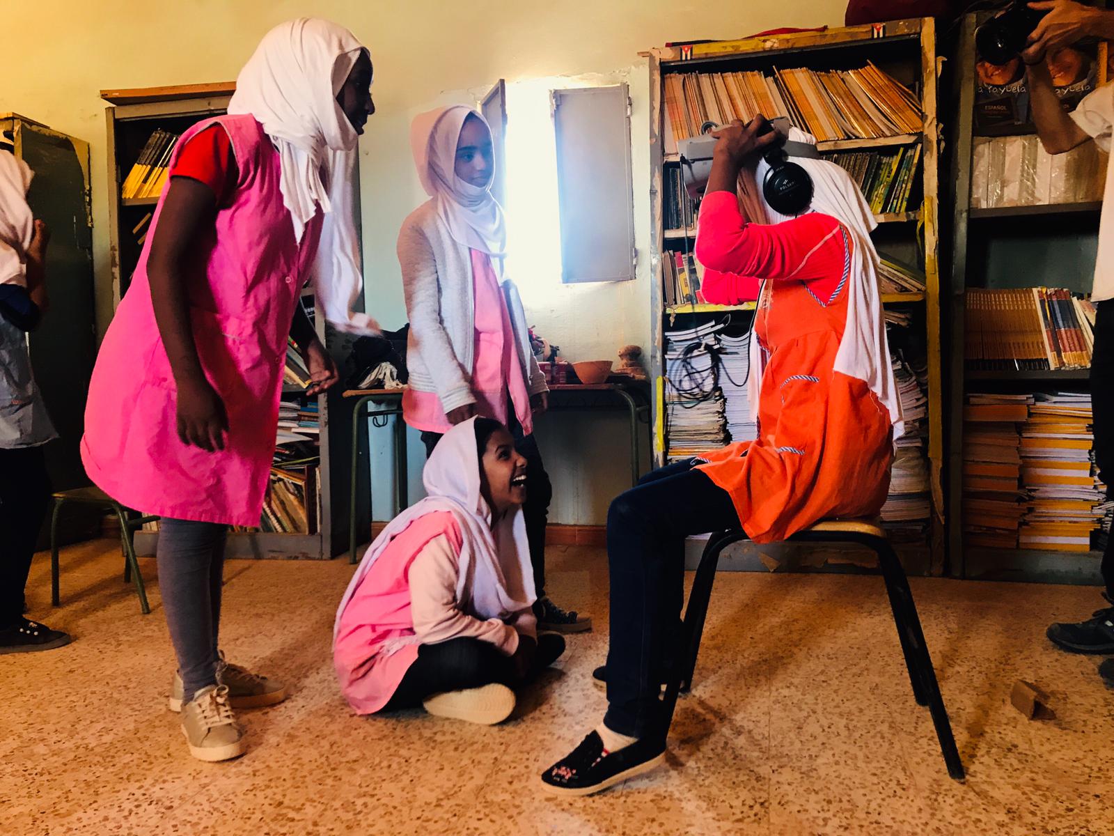 Un grupo de alumnas de la escuela secundaria de Dajla se divierte durante la actividad de “CineClub Astronómico”, que incluía un vídeo de realidad virtual. La actividad estaba liderada por los cineastas Felipe Carreli y Demetrio Rodrigues.