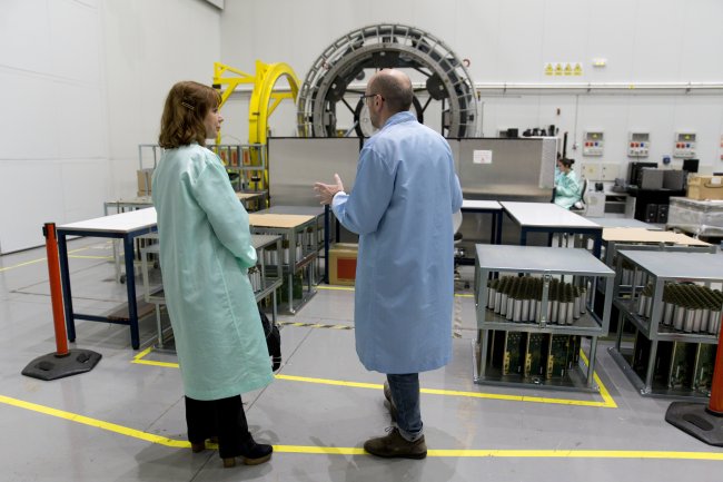 Ángela Vallvey con el físico, ingeniero y escritor Enrique Joven, en el Área de Instumentación. Crédito: Elena Mora (IAC).