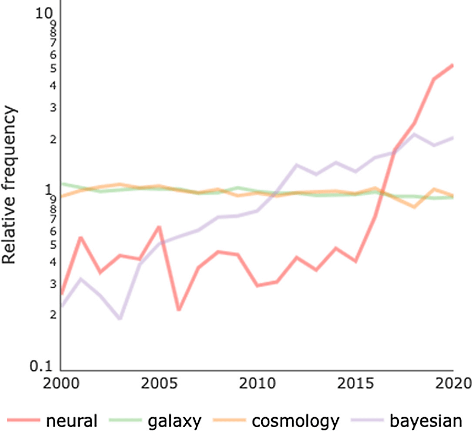 Cambio relativo del número de artículos en arXiv:astro-ph con diferentes palabras clave en el resumen en función del tiempo. El número de trabajos que mencionan redes neuronales en el resumen ha experimentado un crecimiento sin precedentes en los últimos ~ 6 años, significativamente más pronunciado que cualquier otro tema en astrofísica. Fuente: ArXivSorter
