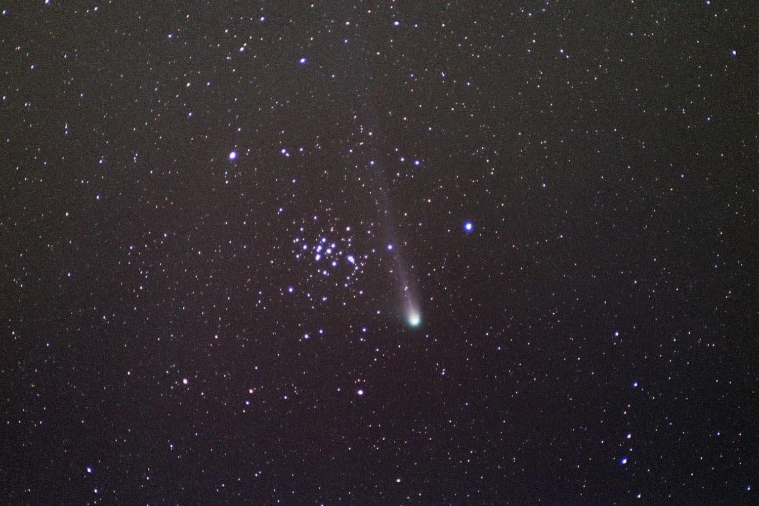 Cometa Q4 y cúmulo M44. Esta imagen muestra al cometa Q4, descubierto en 2001 gracias a un programa para la detección de asteroides que puedan pasar cerca de la Tierra (NEAT, Near Earth Asteroid Tracking). El cometa tuvo su máximo acercamiento a la Tierra en mayo de 2004, y en esta fotografía aparece en las cercanías del cúmulo abierto del Pesebre, M44.