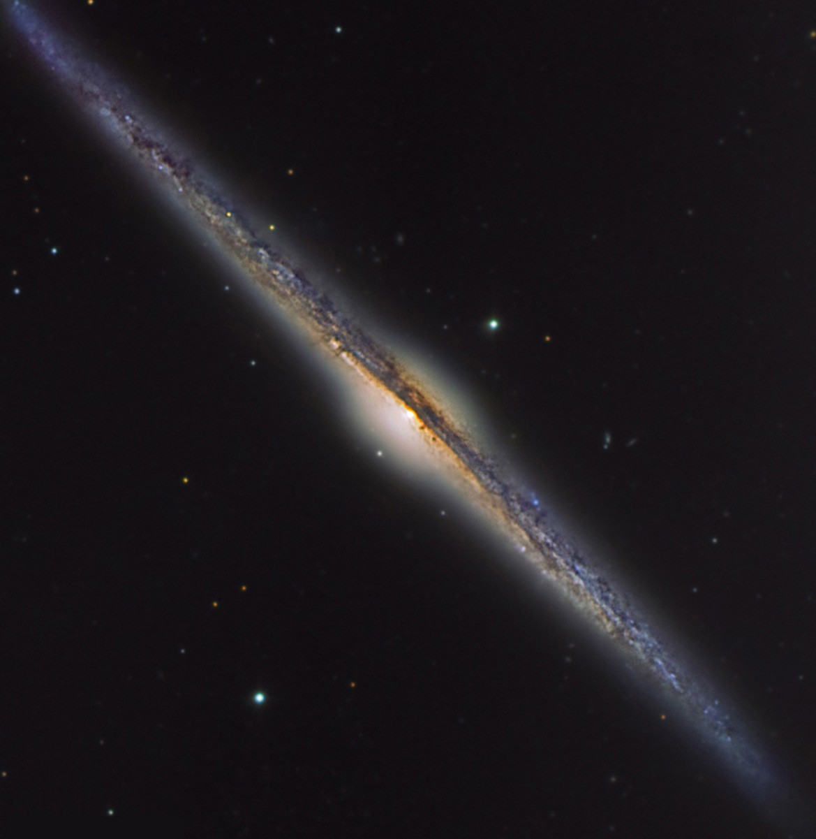 NGC 4565, también conocida como la galaxia de la aguja debido a la forma que ofrece, constituye uno de los mejores y más espectaculares ejemplos de una galaxia espiral vista justo de perfil.