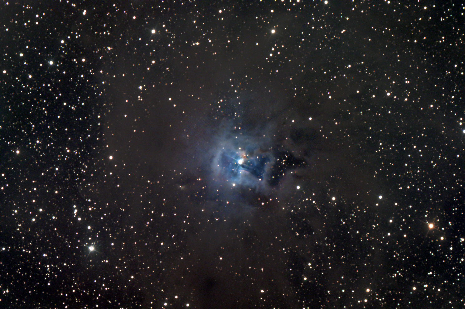 NGC 7023, más conocida como la Nebulosa Iris, es una nebulosa de reflexión situada en la constelación de Cefeo. La materia gaseosa y el polvo de la nebulosa dispersa la luz de la estrella central cercana y masiva visible en la imagen. La diferencia entre este tipo de nebulosas con las de emisión es que estas últimas obtienen el gas ionizado a partir de la estrella central, de manera que emite por sí mismo. En el caso de las nebulosas de reflexión, el polvo que rodea a la estrella (aún en formación) no emite, sino que dispersa la luz de la estrella, de ahí su color azulado. Otro ejemplo claro de este tipo de nebulosas lo encontramos en las Pléyades, IAM de abril de 2008.