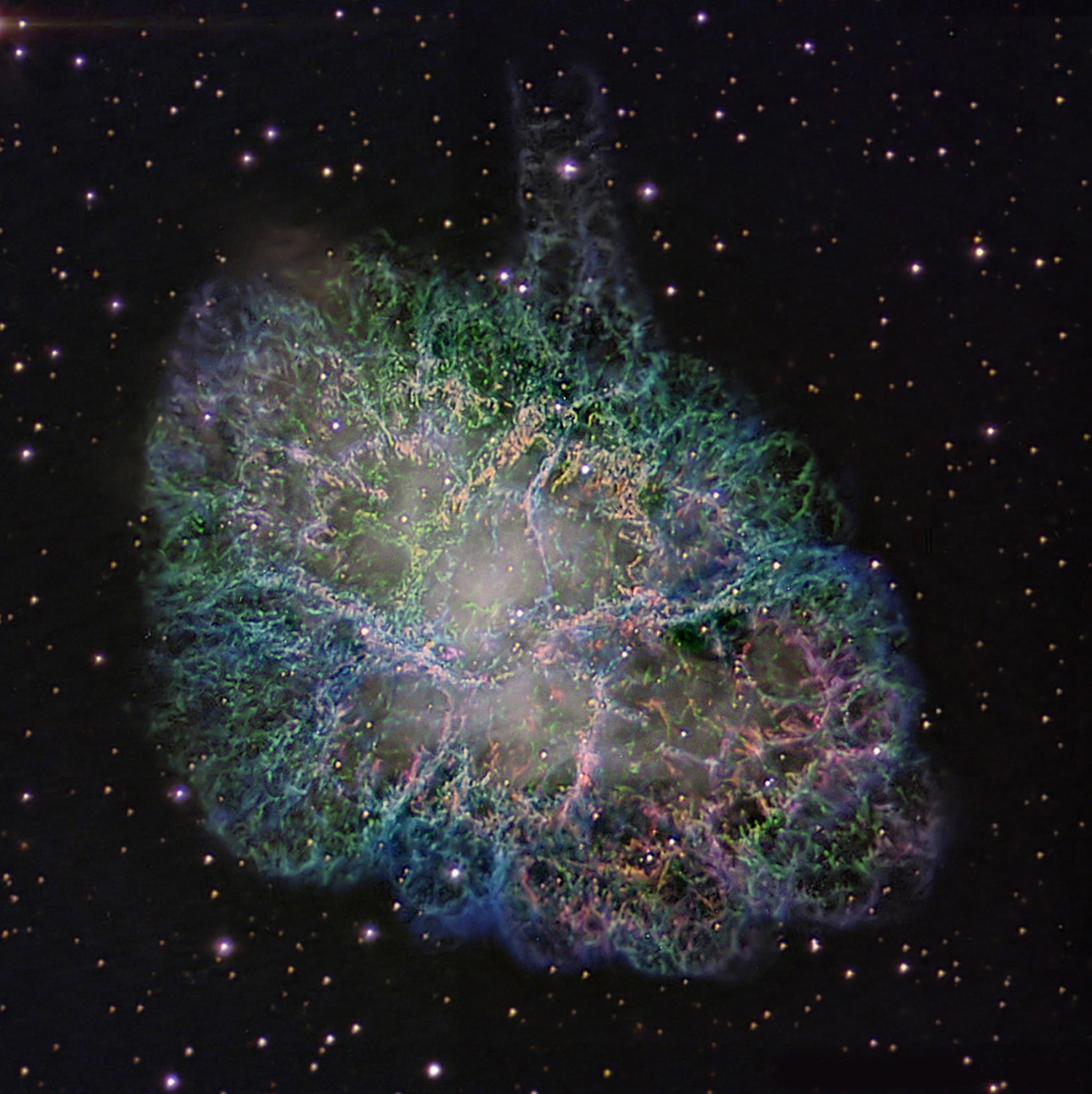 La nebulosa está formada por los restos del material eyectado por la explosión de la supernova, mientras que en el centro se encuentra una estrella de neutrones, un púlsar que gira a unas 30 revoluciones por segundo. Estos objetos tienen una densidad tan extrema que es equivalente a concentrar toda la masa de nuestro sol en un volumen de unos 30 km, es decir, que una cucharada de té de este material pesaría unas 100 millones de toneladas.