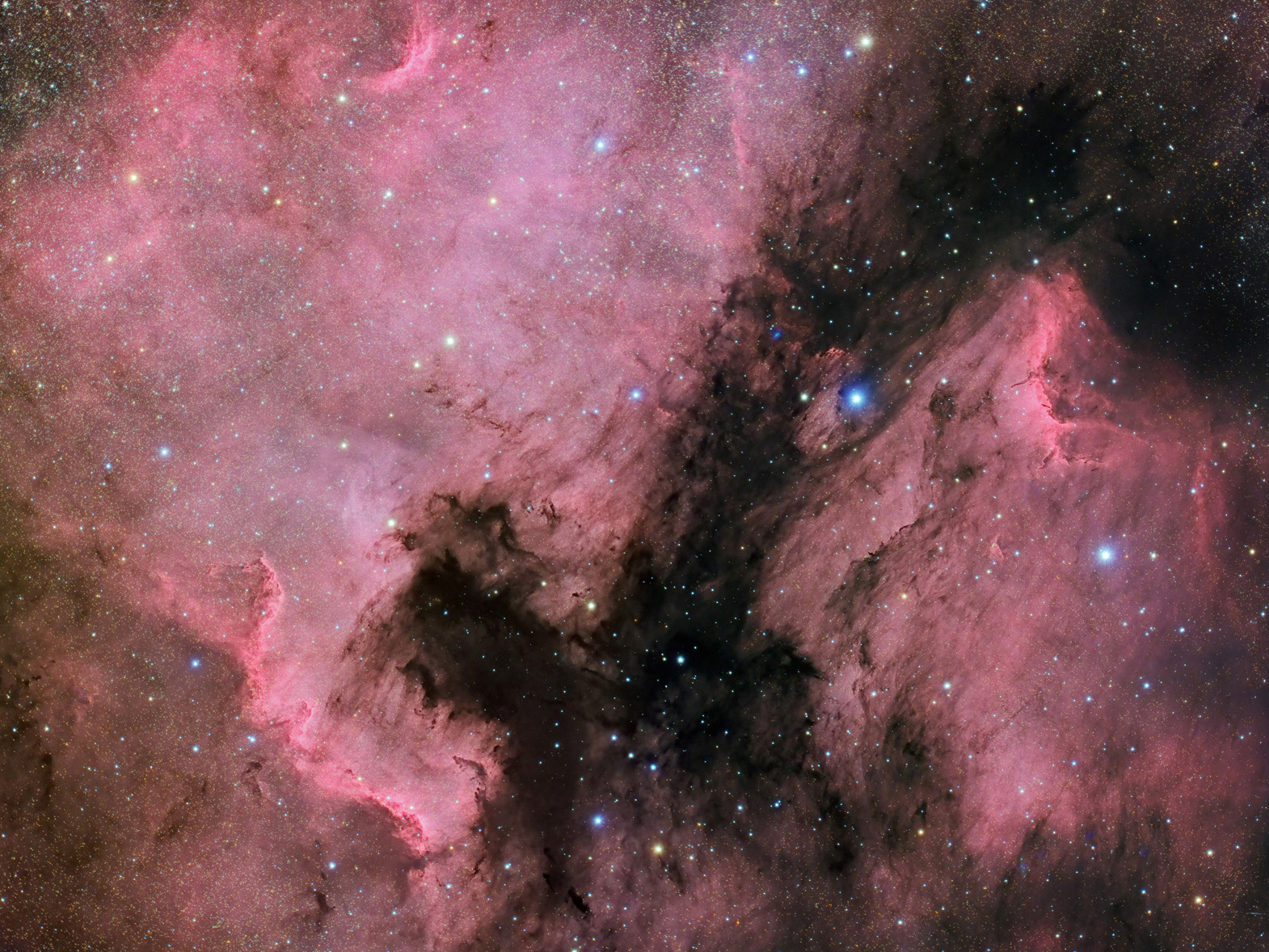 La imagen muestra un mosaico del complejo de nebulosas de emisión Norteamérica y Pelícano (NGC 7000 e IC 5070) situado en la constelación del Cisne. La primera de ellas, en la parte izquierda, se denomina de esta forma por su semejanza con el continente norteamericano, mientras que la segunda, en la parte derecha, muestra una extraña semejanza con un pelícano. A pesar de parecer dos nebulosas independientes, realmente forman parte de la misma nebulosa. La razón de esta separación aparente se encuentra en una región muy densa de material interestelar situada delante de ellas que absorbe la luz de las mismas. Esta región se puede apreciar en el centro de la imagen como un \\"hueco\\" muy oscuro que incluso tapa la luz de estrellas débiles.