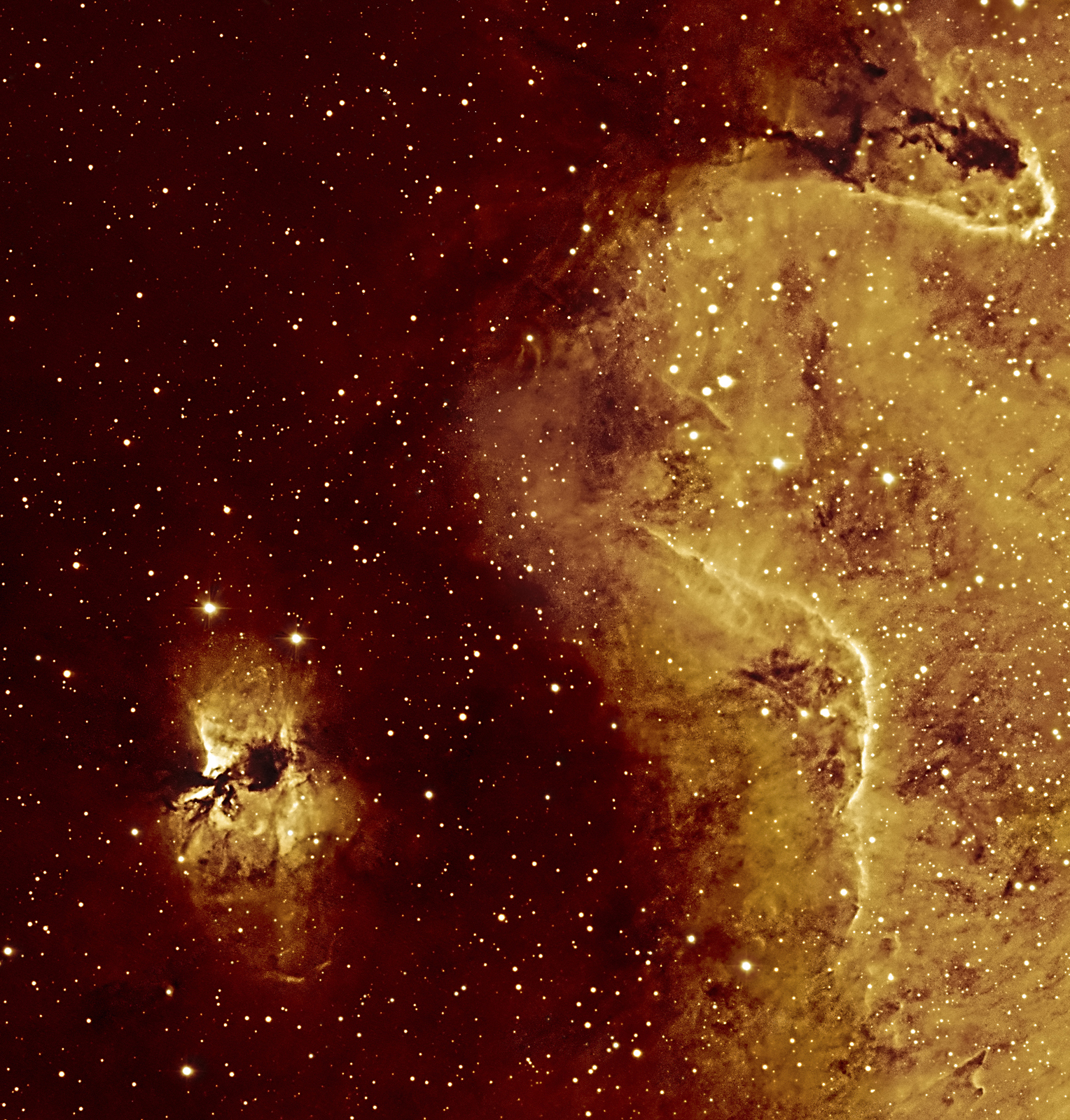 La imagen es un mosaico de 3x3 apuntados con el telescopio IAC80 y el filtro Halfa [NII] (ancho de banda de 5 Angstrom), que abarca un campo de unos 30x30 minutos de arco en el cielo. Cada imagen del mosaico es en realidad el promedio de tres imágenes de 20 minutos de exposición.