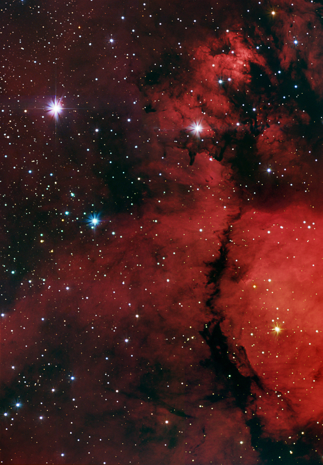 IC 1795 es una inmensa región HII compuesta por nubes de gas y polvo donde se están formando nuevas estrellas. La asociación OB de estrellas jóvenes dentro de IC 1795 ioniza las regiones HII de este gigantesco complejo de nubes moleculares conocido como W3. El complejo se encuentra en el brazo de Perseo de la Galaxia, y contiene varias zonas espectaculares de formación estelar de pequeña y gran masa: W3-Norte, W3-principal y W3-OH (Roccatagliata et al. 2011). IC 1795 está situada justo en la punta del corazón de la famosa Nebulosa del Corazón (IC 1805). También conocida como NGC 896, esta fábrica de estrellas se encuentra en la constelación de Casiopea. Se cree que la asociación OB se halla a la misma distancia que W3-OH, 2.0 kpc, medida con precisión a partir de cinemática máser (Xu et al. 2006; Hachisuka et al. 2006). La imagen se obtuvo con el telescopio IAC80 de 0,82 m de diámetro, y es en realidad un mosaico de 2x3 imágenes a través de los filtros H?BVR.