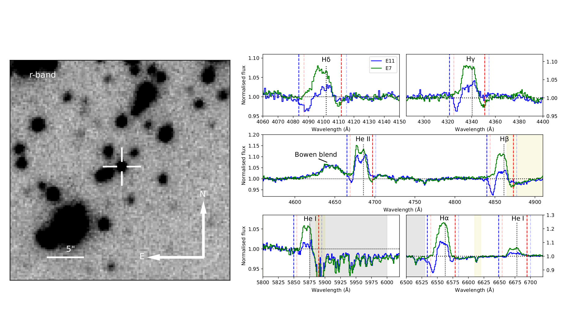 Panel izquierdo: carta de identificación de Swift J1727.8-162 en banda r. Panel derecho: Espectros en dos épocas del sistema, con las líneas relevantes marcadas, mostrando diversos ejemplos de vientos eyectados y en caída al agujero negro.