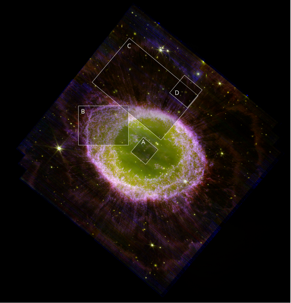 El campo de visión completo obtenido con NIRCam, con recuadros para indicar la ubicación de los campos resaltados en otras figuras relacionadas. La región A muestra la estrella central; la región B destaca los miles de densos cúmulos del anillo principal; la región C muestra las "rayas" radiales que aparecen en el halo exterior; y la región D muestra mechones de gas aún más alejados. Crédito: JWST/NIRcam.