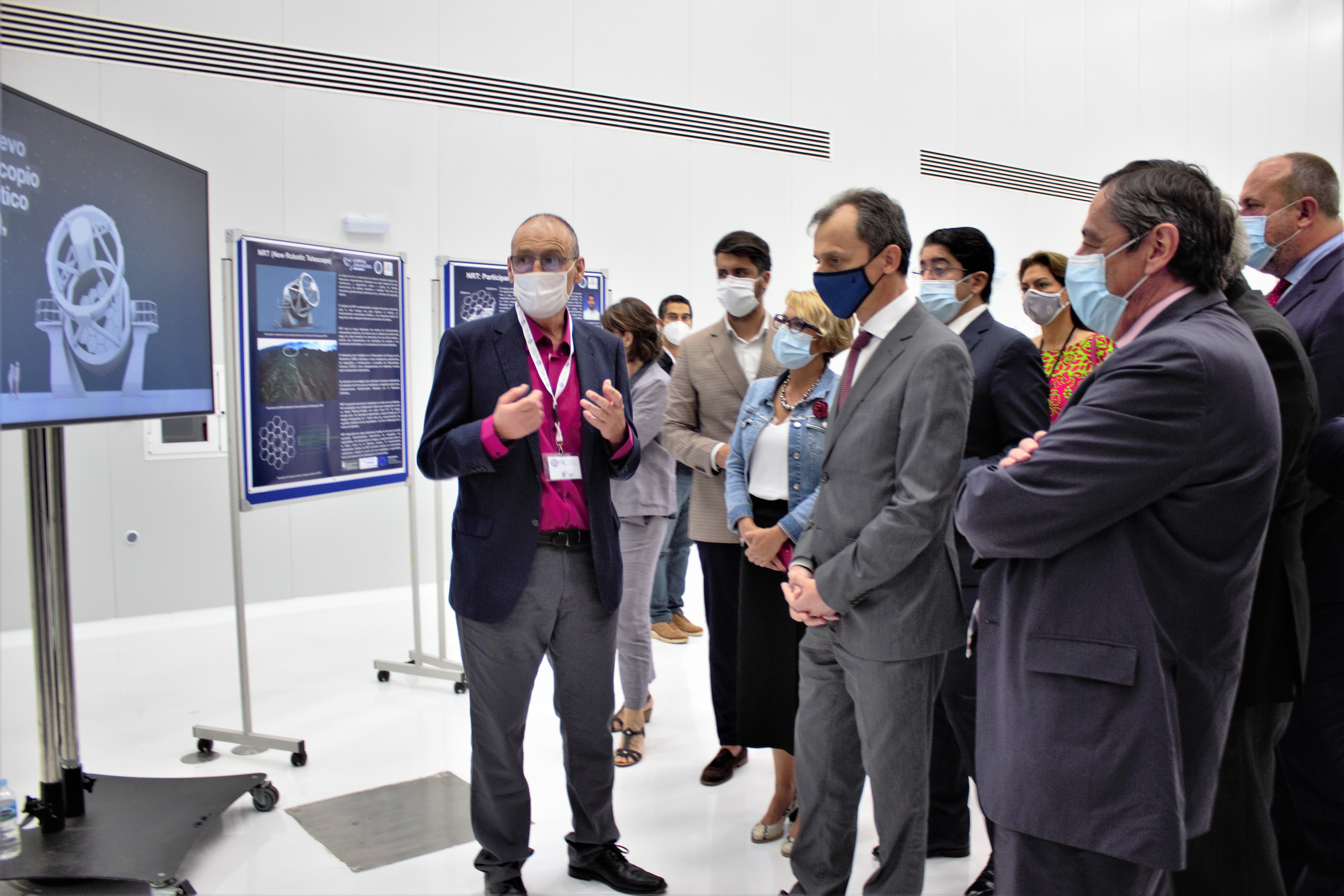 Carlos Gutiérrez habla sobre NRT con Pedro Duque y otros visitantes en el edificio de IACTEC. En la imagen: Carlos Gutiérrez, IP del proyecto del NRT en el IAC, Pedro Duque, Ministro de Ciencia e Innovación, Rafael Rodrigo, Secretario Gral. de Investigac.