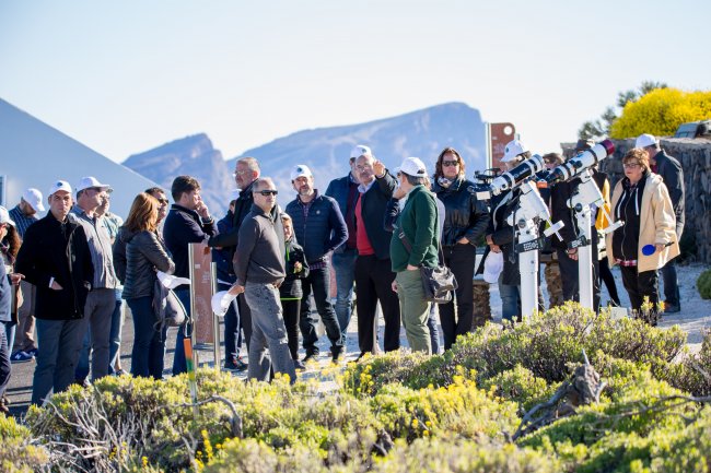 Asistentes a la presentación de "CosmoLAB: el Sistema Solar como laboratorio en el aula" en el Observatorio del Teide tras la actividad de observación solar. Crédito: IAC.