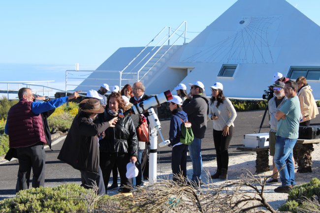 Soledad Monzón, consejera de Educación y Universidades del Gobierno de Canarias, junto a un telescopio solar durante la presentación del proyecto "CosmoLAB: el Sistema Solar como laboratorio en el aula" en el Observatorio del Teide. Crédito: Alejandra Rueda (IAC).