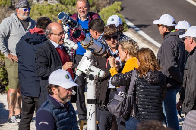 Autoridades asistentes a la presentación de "CosmoLAB: el Sistema Solar como laboratorio en el aula" en el Observatorio del Teide durante la actividad de observación del Sol. Crédito: IAC.