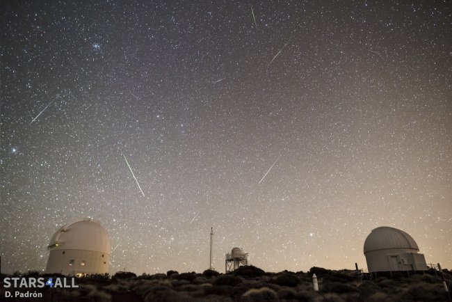 Meteoros registrados en el Observatorio del Teide (IAC) entre las 06:13h y las 06:38h UT (hora local canaria) del día 4 de enero de 2107. La estrella más brillante a la izquierda es Procyon (Canis Minor), Castor y Pollux (Géminis) casi en el centro. El cúmulo que se observa en la parte superior es el del Pesebre (Beehive Cluster) en la constelación de Cáncer. La mayor parte de loa meteoros registrados son Cuadrántidas.