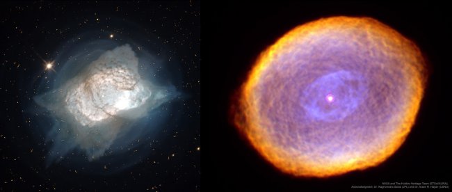 Imágenes de las nebulosa planetarias NGC 7027 (izquierda) e IC 418 o nebulosa del espirógrafo (derecha) en las que se han detectado rasgos de emisión que confirman la presencia de elementos muy pesados. Crédito: NGC 7027: Hubble Legacy Archive, ESA, NASA. Procesado: Delio Tolivia Cadrecha); IC 418: Hubble Heritage Team (STScI/AURA), R. Sahai, A. R. Hajian