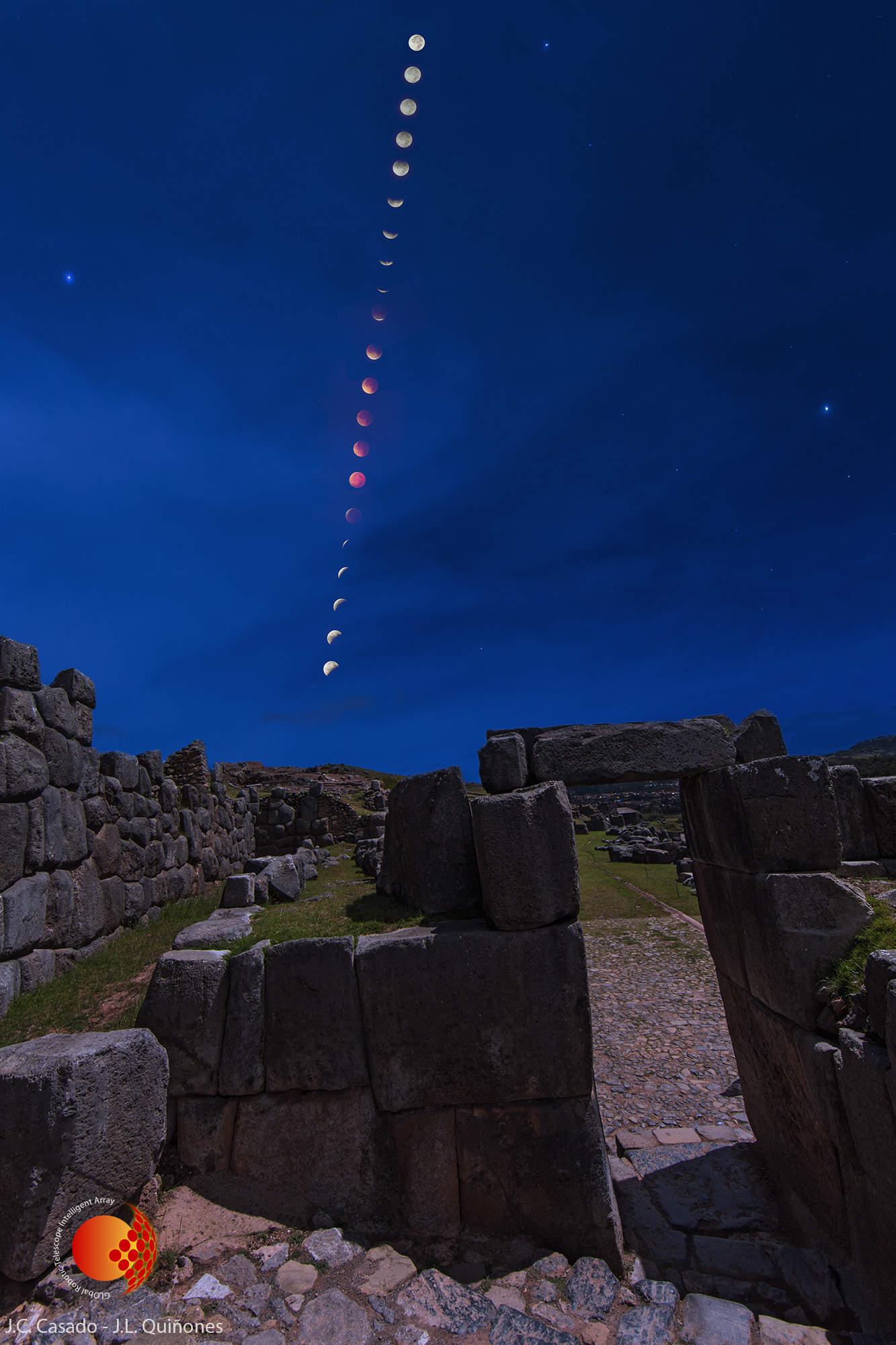 Composición de la evolución del eclipse desde la puerta principal de acceso a la fortaleza Inca de Saqsaywaman. Crédito: J.C. Casado - J.L. Quiñones, Proyecto GLORIA
