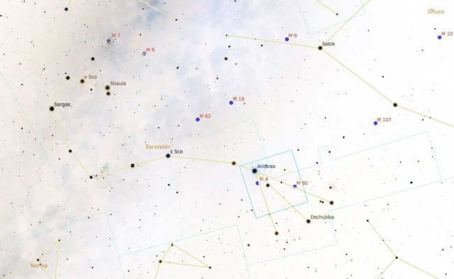 Localización y dimensiones del campo cubierto (cuadrado azul) por la imagen presentada. Gráfico obtenido con Stellarium.