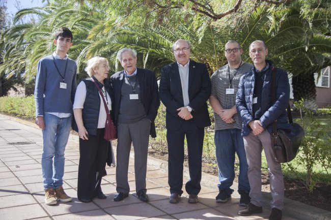 En el centro de la imagen, el premio nobel Claude Cohen-Tannoudji, acompañado de su mujer; y el director del IAC, Rafael Rebolo (izquierda y derecha respectivamente); y estudiantes y organizadores del COEFIS XI. Crédito: Inés Bonet.