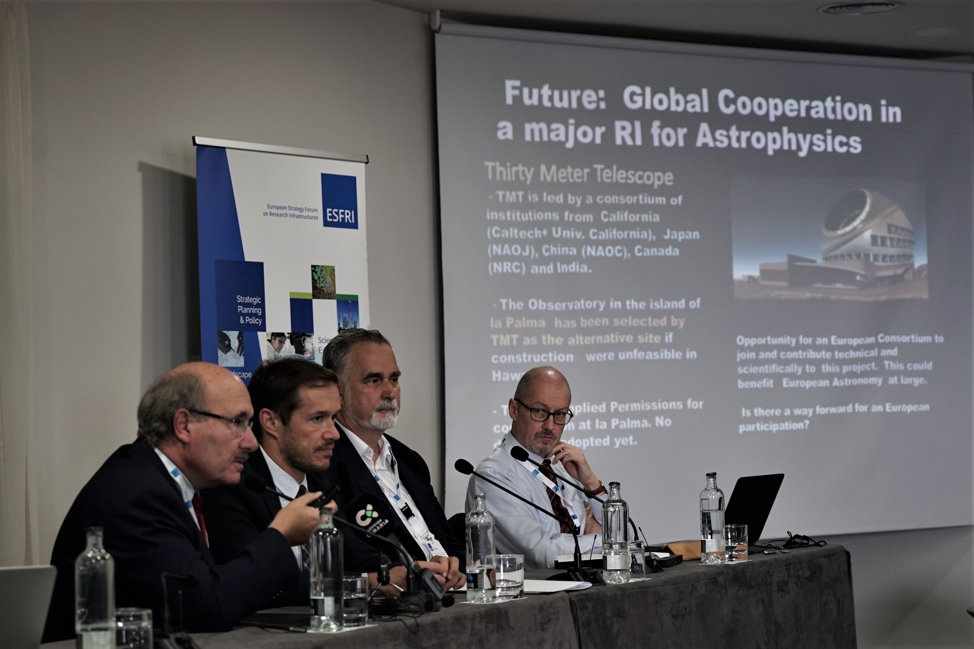 Sesión de apertura de la reunión ESFRI celebrada en La Palma. (De izquierda a derecha) Rafael Rebolo, Mariano Hernández Zapata, Jan Hrusak y Adam Tyson. Crédito: Iván Jiménez (IAC)