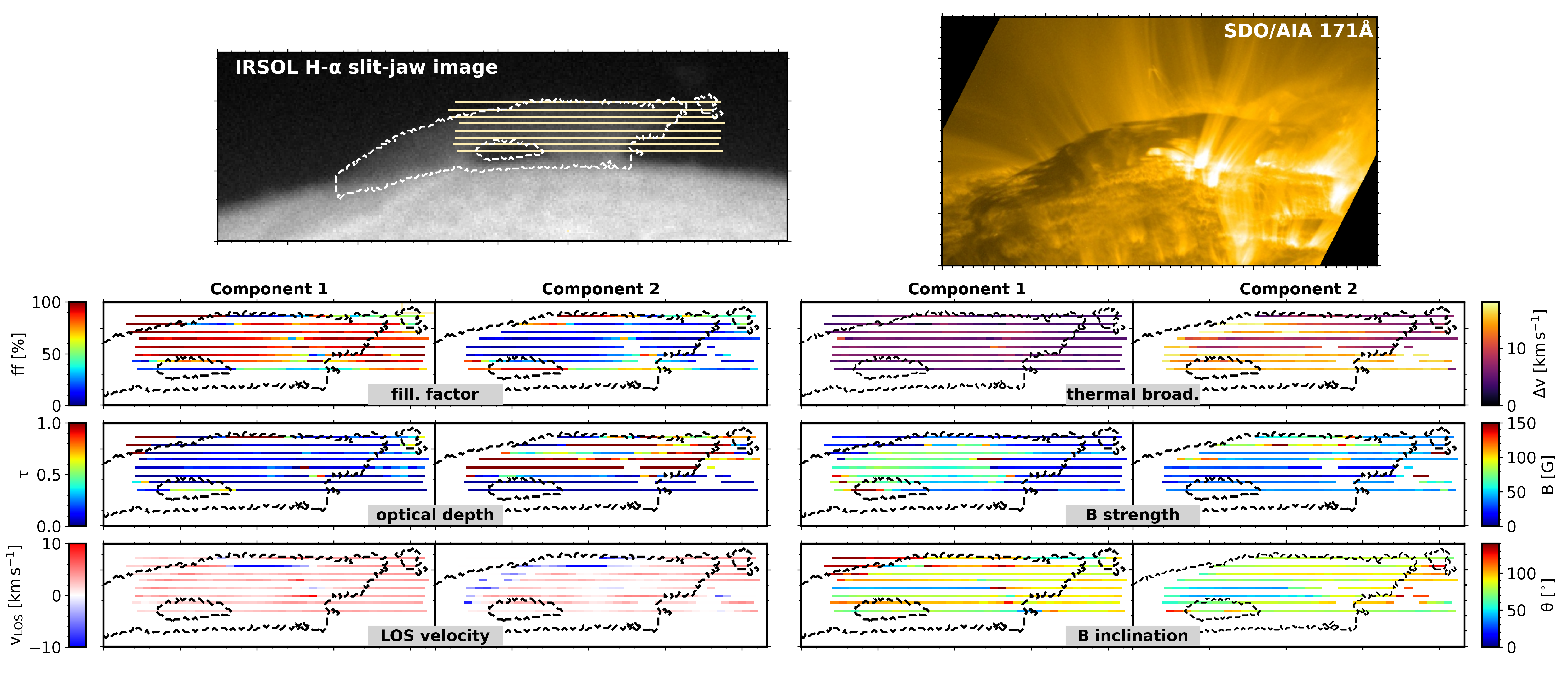 Imágenes de la protuberancia y parámetros inferidos para cada componente en las posiciones observadas (en amarillo en panel superior izquierdo). Las rendijas pintadas son más anchas que en la observación. Las marcas principales de los ejes indican 50”.