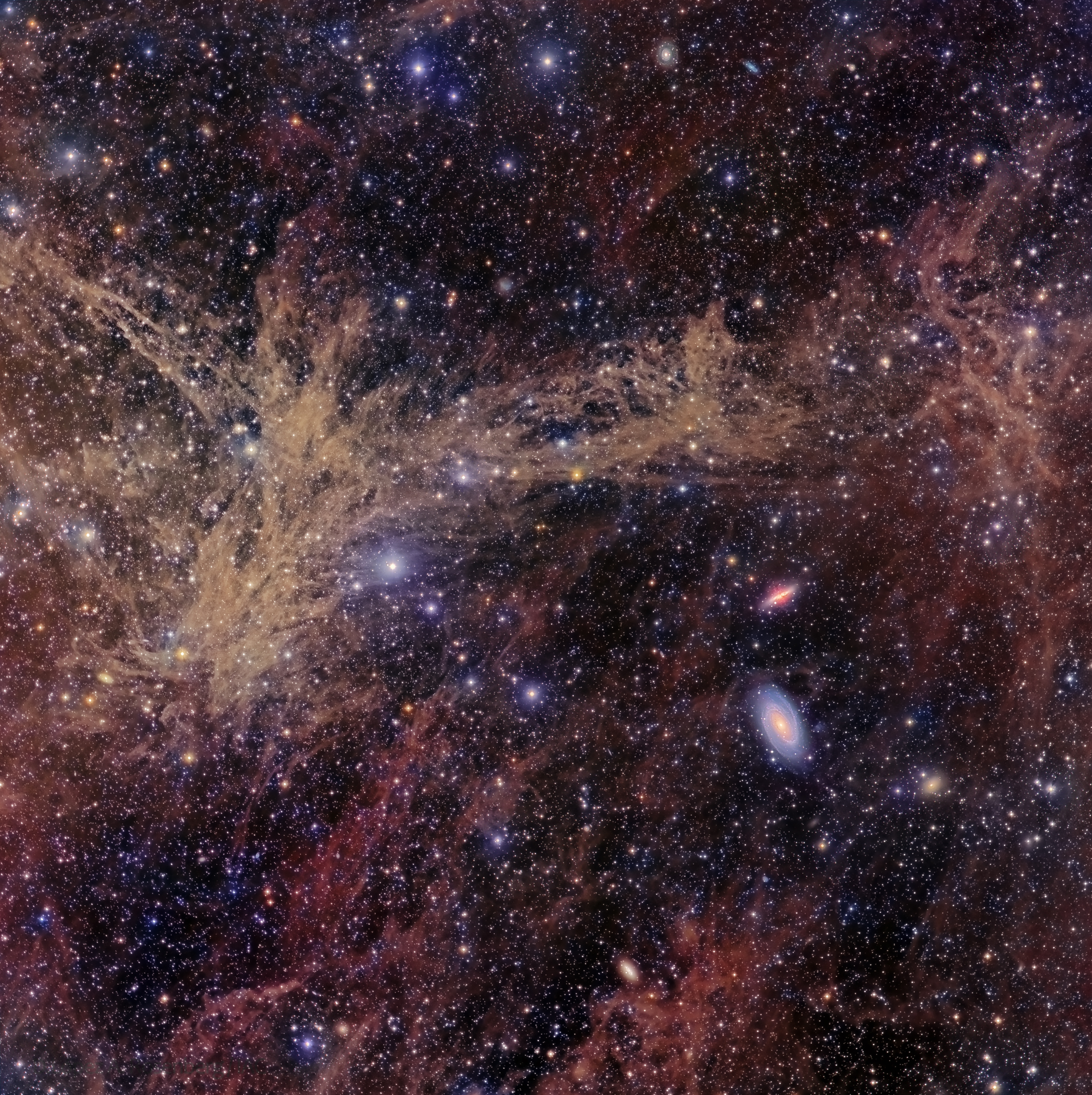 El Grupo de M81 es el Grupo Galáctico más próximo al nuestro, situado a unos 12 millones de años luz. Esta pequeña distancia nos convierte en vecinos dentro del Cúmulo de Galaxias de Virgo (#9). En la imagen, destacan dos galaxias (M81 y M82), que danzan la una en torno a la otra. Ambas definen el núcleo que aglutina al resto del grupo, compuesto por al menos 34 galaxias, de las que podemos ver 5 más en esta imagen (Holmberg I, NGC2976, Holmberg IX, NGC3077 y UGC5423). M81 es también conocida como la “Nebulosa de Bode” o NGC3031, una galaxia espiral de dimensiones similares a la nuestra. Por su parte, M82 también recibe el nombre de “Galaxia del Cigarro” o NGC3034, una galaxia con un núcleo activo que presenta intensos brotes de formación estelar y en cuyo centro se ha encontrado un Agujero Negro Supermasivo de 70 millones de masas solares. Aparentemente distantes medio grado en el cielo, M81 y M82 se encuentran realmente separadas por unos 150.000 a.l., ni una décima parte de la distancia que nos separa de Andrómeda.