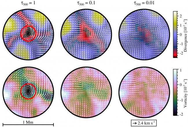 El panel superior muestra las diferentes velocidades horizontales a tres alturas distintas, mientras que el panel inferior muestra la velocidad de rotación vertical. Los círculos rojos, con 150 km de radio, muestran el tamaño del flujo de los vórtices pequeños. Crédito: Andrés Asensio (IAC).
