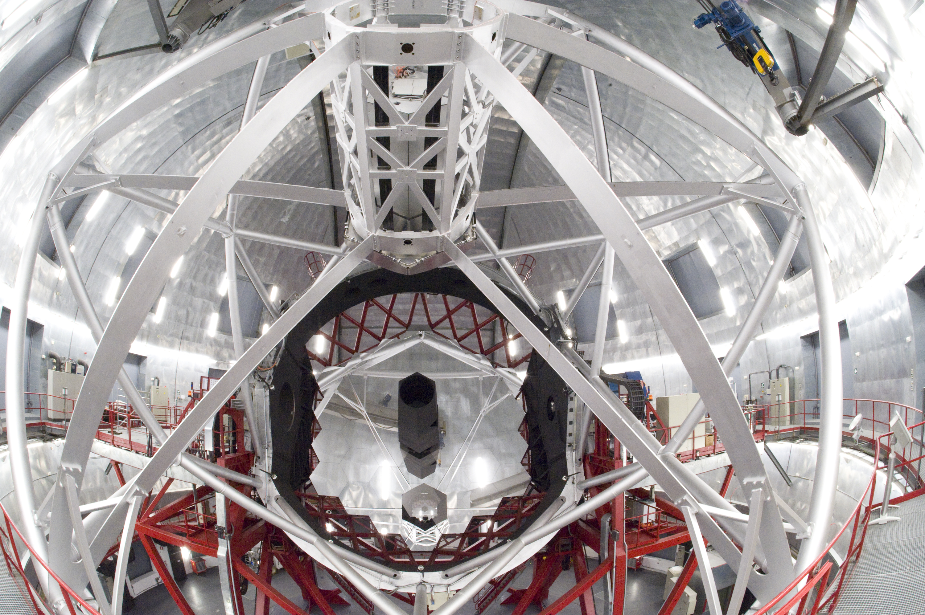 Interior del la cúpula del Gran Telescopio CANARIAS (GTC). En la imagen puede apreciarse su espejo primario, el secundario reflejado, el tubo y la montura.