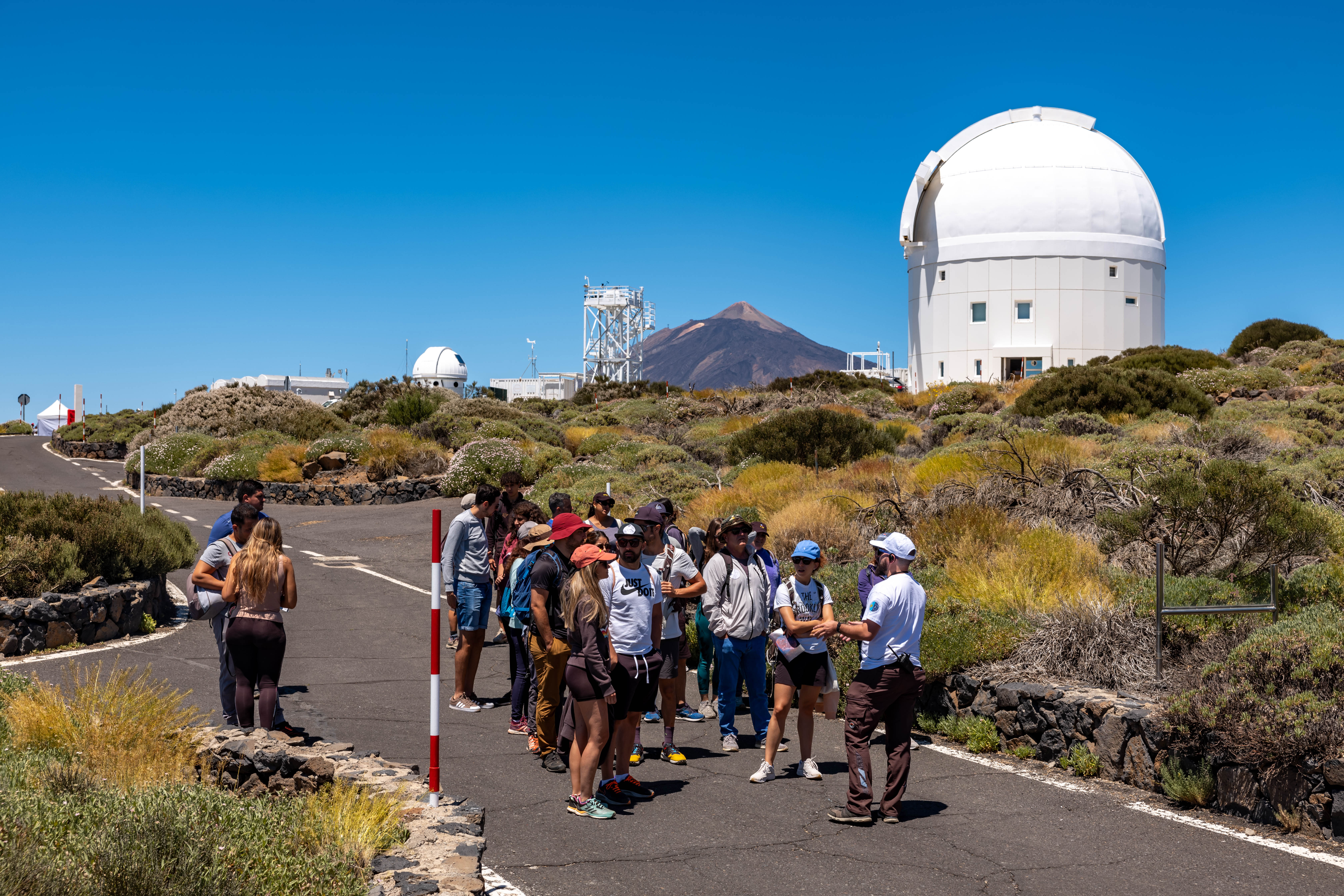 Asistentes a las Jornadas de Puertas Abiertas al Observatorio del Teide 2023 frente a la Optical Ground Station.