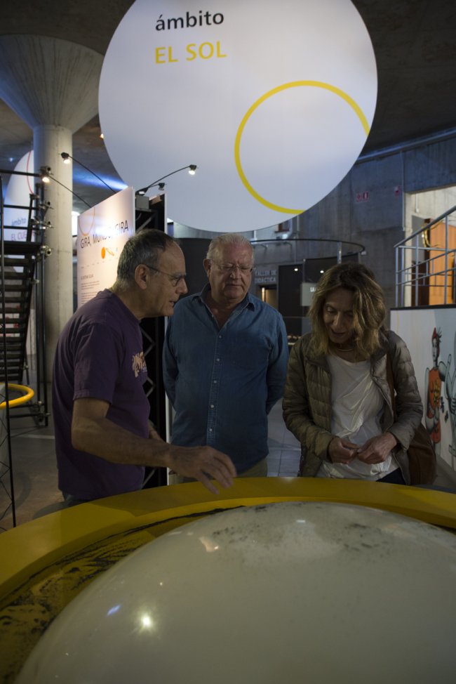 Juan Jesús Armas Marcelo y su esposa con Antonio Mampaso, director del Museo de la Ciencia y el Cosmos, de Museos de Tenerife, atendiendo a las explicaciones el funcionamiento del magnetismo del Sol. Crédito: Elena Mora (IAC).