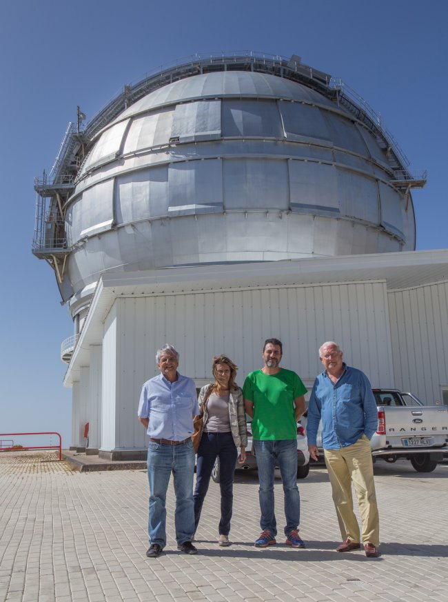 Juan Jesús Armas Marcelo y su esposa con el astrónomo y Juan Carlos Pérez Arencibia, administrador del Observatorio del Roque de los Muchachos (Garafía, La Palma) ante el Gran Telescopio CANARIAS (GTC). Crédito: Daniel López/IAC.