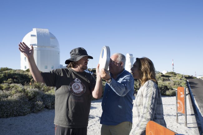 Juan Jesús Armas Marcelo y su esposa con Alfred Rosenberg, astrofísico y divulgador del IAC, observando el Sol con un filtro Halfa en el Observatorio del Teide (Izaña, Tenerife). Crédito: Elena Mora (IAC).