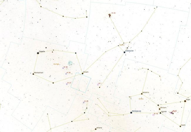 Localización del remanente de la supernova S147 entre los cuernos del Toro. La extensión del campo observado equivale a 10x10 Lunas en el cielo. Muy cerca de este campo se encuentra otro famoso remanente de supernova, Messier 1, también conocido como Nebulosa del Cangrejo. En la imagen se ha evitado el brillo de la estrella ß-Taurus (Elnath, que significa “el que da cornadas” en árabe), la segunda estrella más brillante de la constelación del Toro tras la estrella Aldebarán. (Imagen de Stellarium).