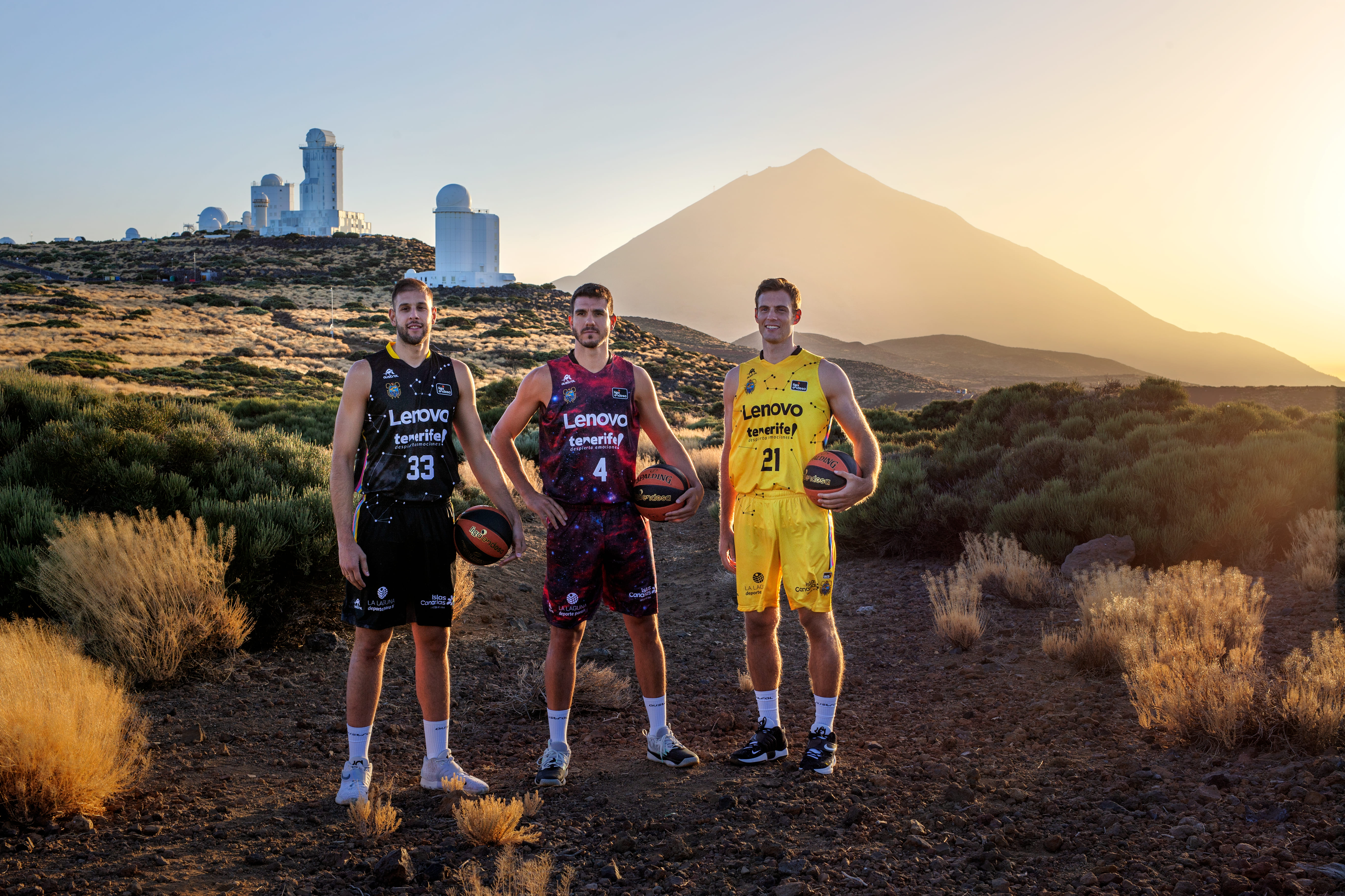 Los jugadores del Lenovo Tenerife con las nuevas equipaciones inspiradas en el cielo de Canarias