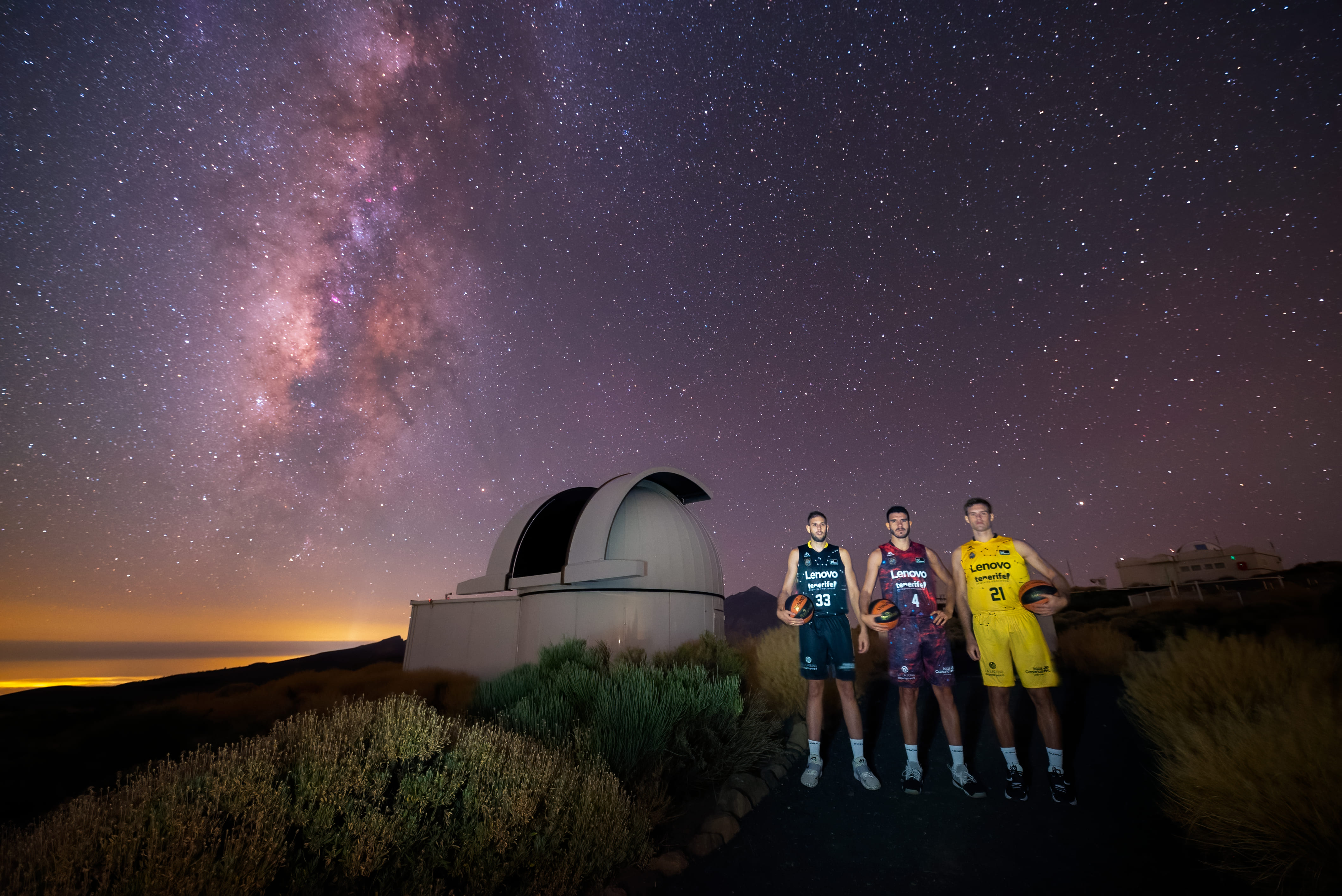 Los jugadores del Lenovo Tenerife Iván Cruz-Uceda , Sergio Rodríguez y Tim Abromaitis con las nuevas equipaciones inspiradas en el cielo de Canarias en el Observatorio del Teide. Créditos: D. López / IAC