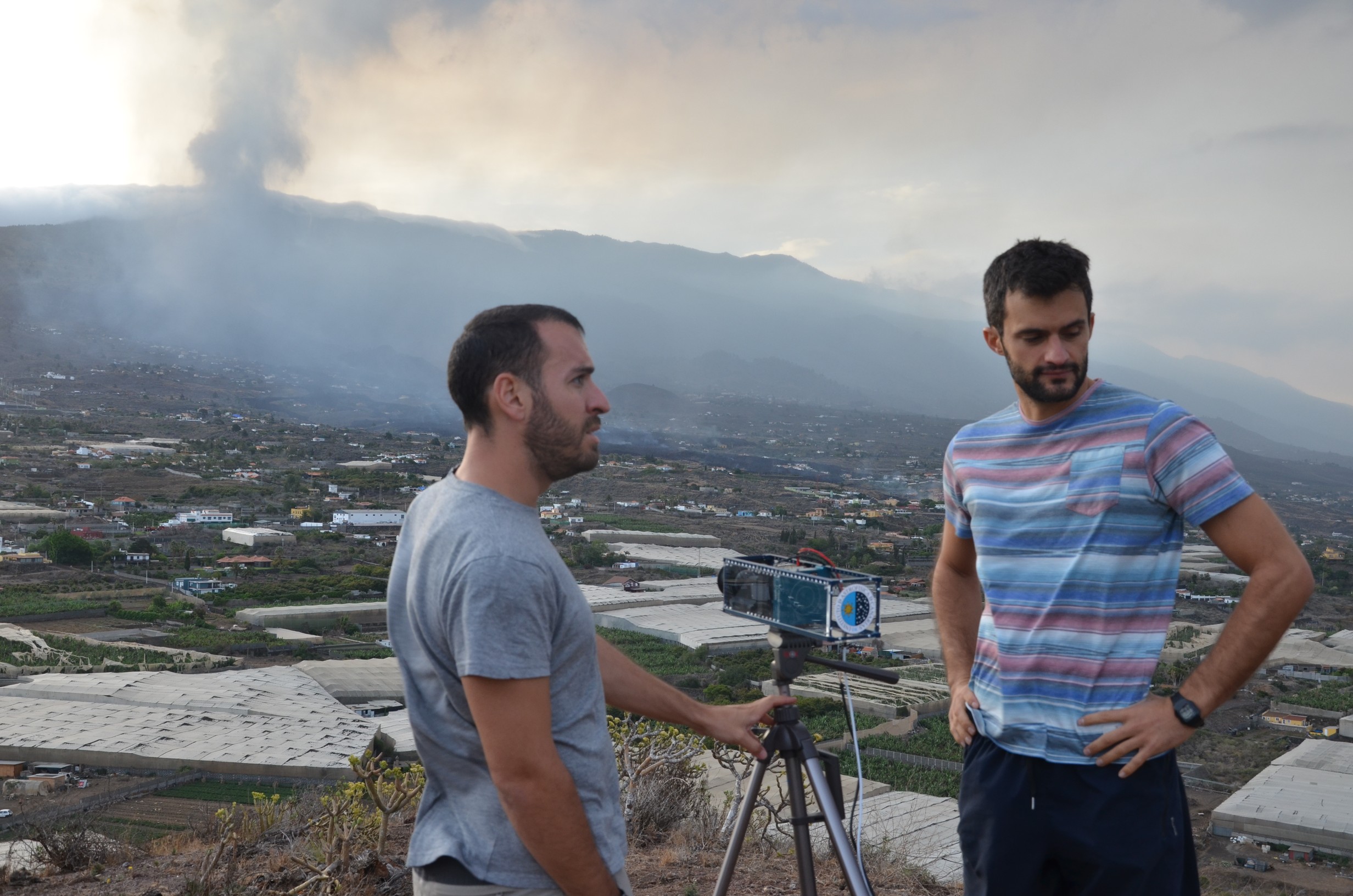 Los ingenieros Ignacio Sidrach y Carlos Colodro tomando imágenes del volcán de Cumbre Vieja, en La Palma, con la cámara DRAGO. Crédito: Sara González (IACTEC-Espacio)