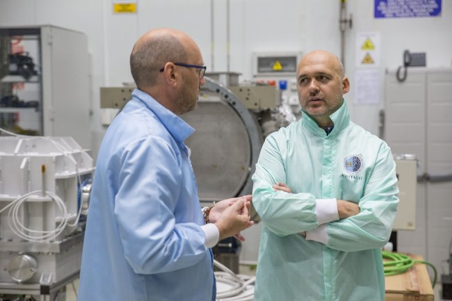 Nicolás Melini y Enrique Joven, ingeniero del IAC, en la Sala de Armado, Integración y Verificación del instituto. Crédito: Elena Mora (IAC).
