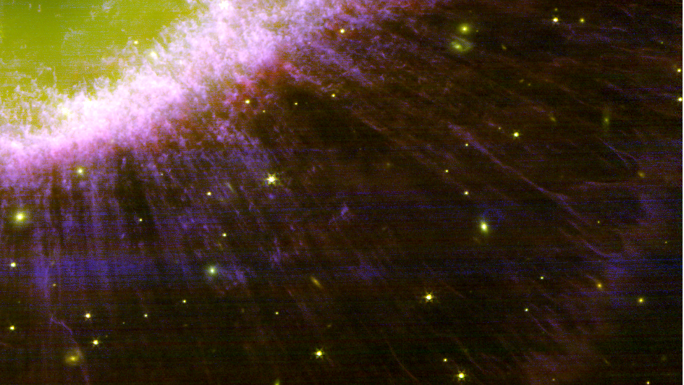 Primer plano de la parte sur del halo exterior, la parte situada fuera del anillo principal. El equipo encontró varios centenares de rasgos lineales, denominados "stripes", que apuntan aproximadamente a la estrella central. Su origen aún no está claro. No se sabe muy bien cómo una sola estrella puede crear una nebulosa tan compleja. El JWST se utilizará para estudiar la estructura y el origen de los cúmulos y las franjas. En el fondo, se pueden ver numerosas galaxias débiles distantes en verde, algunas con una clara estructura espiral. Credit: JWST/NIRcam.