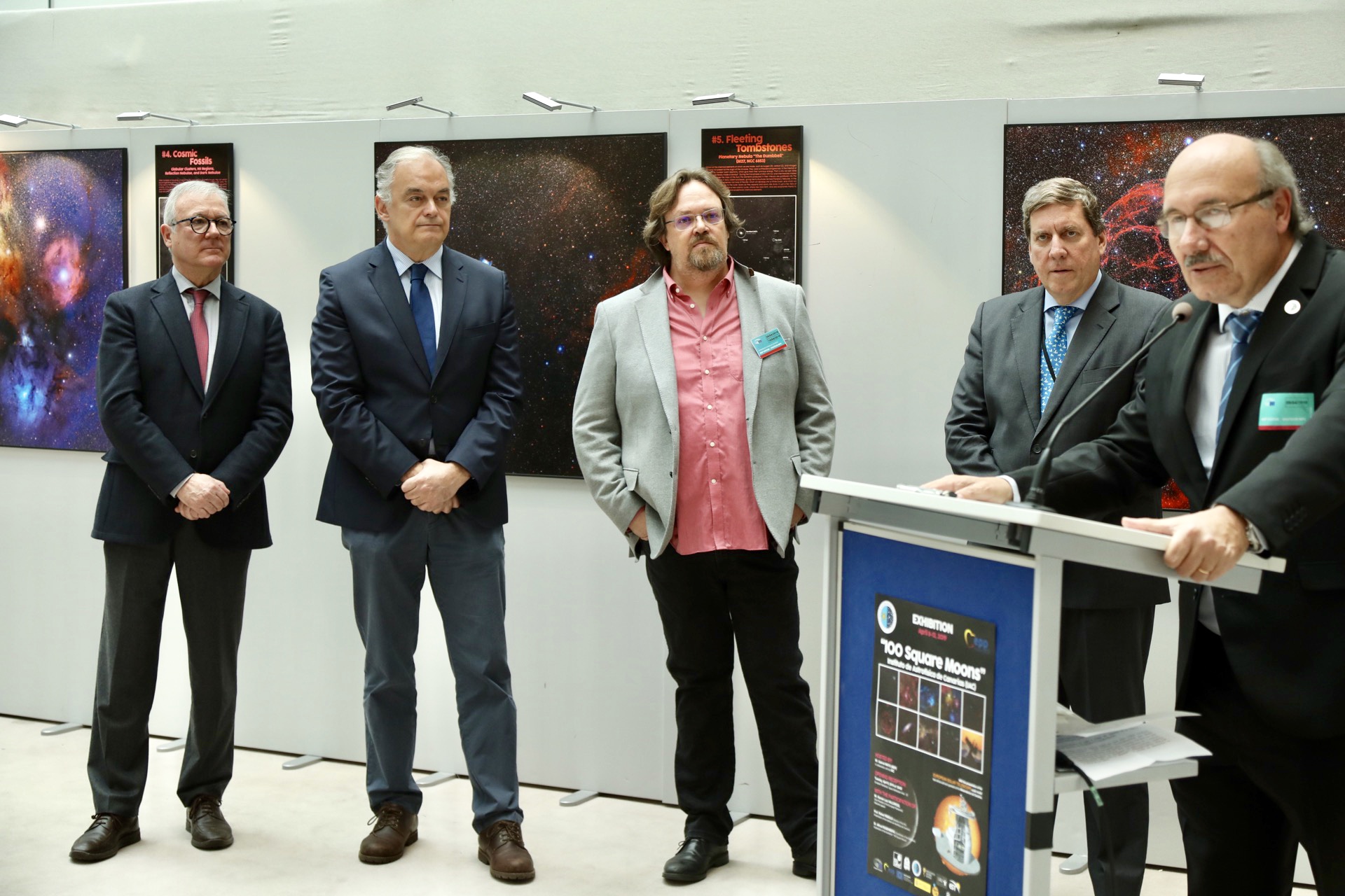De izquierda a derecha: Ramón Luis Valcárcel, Esteban González Pons, Alfred Rosenberg, Gabriel Mato and Rafael Rebolo en la inauguración de "100 Lunas cuadradas" en el Parlamento Europeo. Tras ellos, las imágenes "Cúmulos Globulares, Regiones HII y Nebulosas de Reflexión y Oscuras", "Nebulosa Planetaria Dumbbell (M27, NGC6853)" y "Remanente de Supernova Sharpless 2-240 (Simeis 147)o "Nebulosa Espagueti"". Crédito: Javier Lorenzo Domínguez.