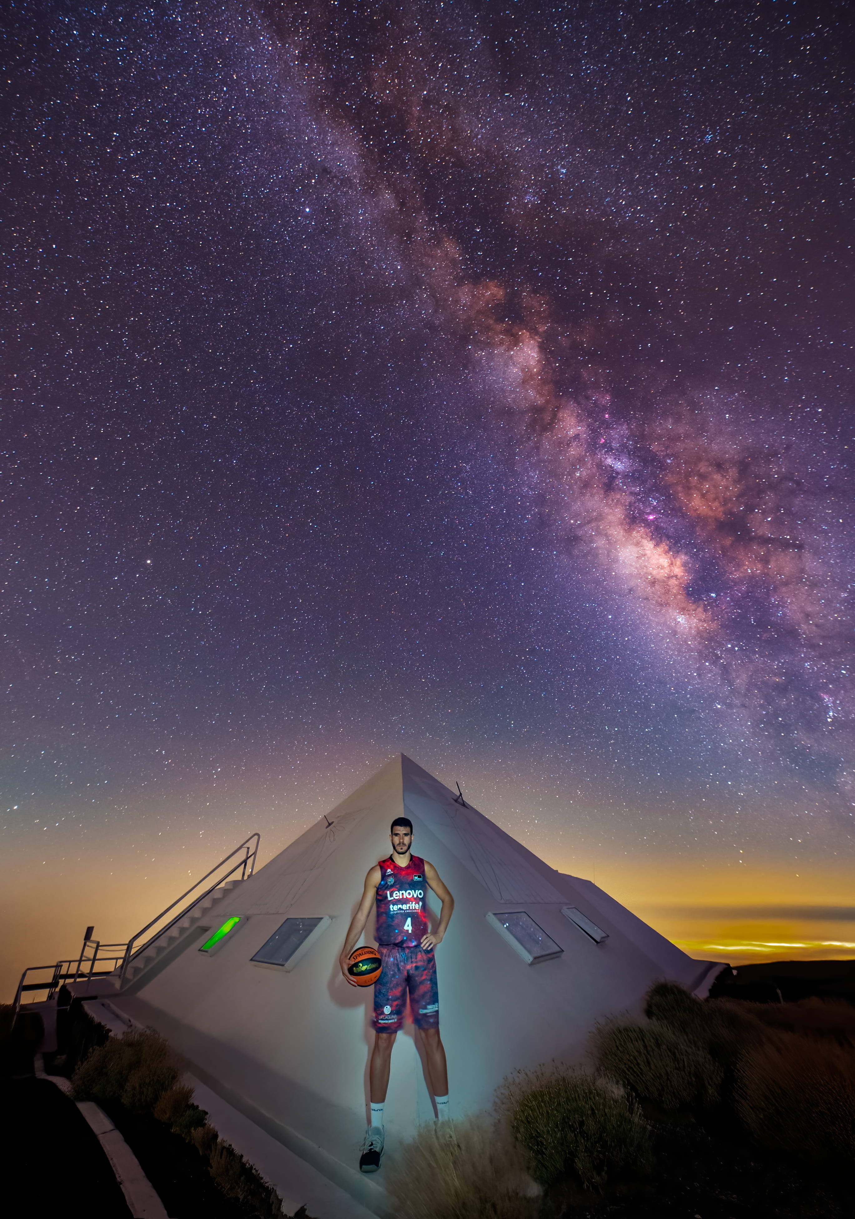 El jugador del Lenovo Tenerife Sergio Rodríguez con las nuevas equipación inspirada enla constelación de Orión en el Observatorio del Teide. Créditos: D. López / IAC