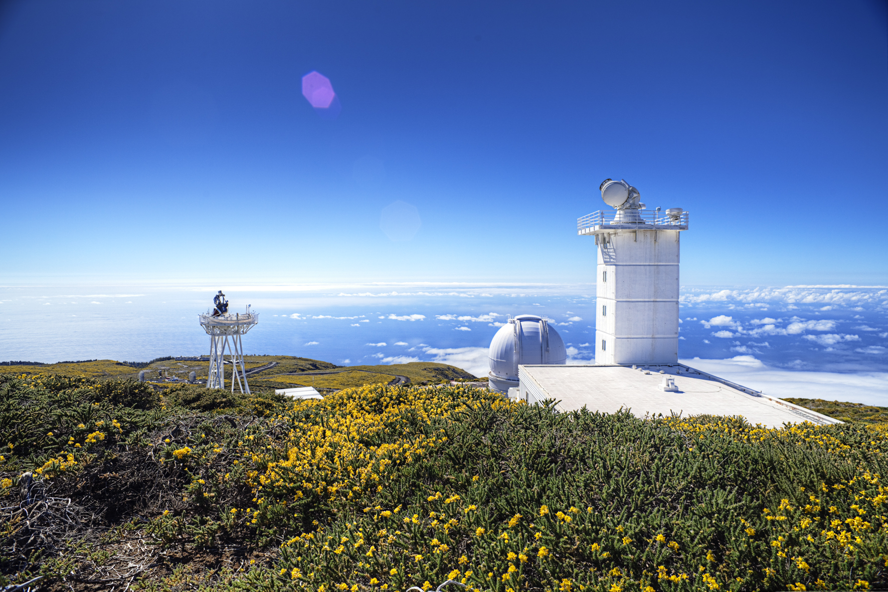 Primavera en el Observatorio del Roque de los Muchachos (La Palma). De derecha a izquierda vemos los telescopios SST, WHT y DOT.