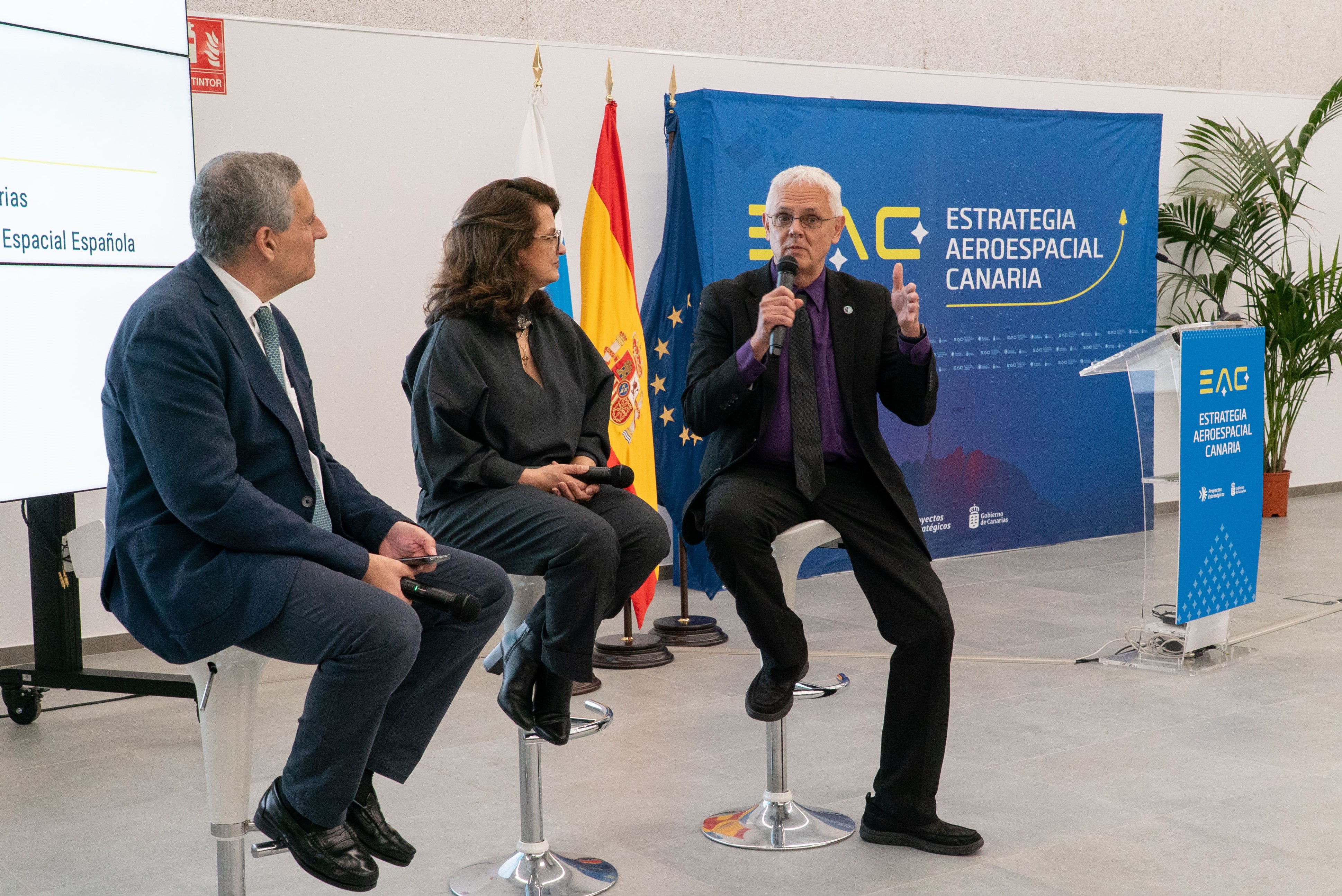 Mesa redonda sobre el Espacio en el marco de la Estrategia Aeroespacial Canaria, con la participación del director del IAC, Valentín Martínez Pillet; la directora de Programas de la Agencia Espacial Española, Mª Cecilia Hernández; y el presidente ejecutivo de Orbex Space, Miguel Belló.