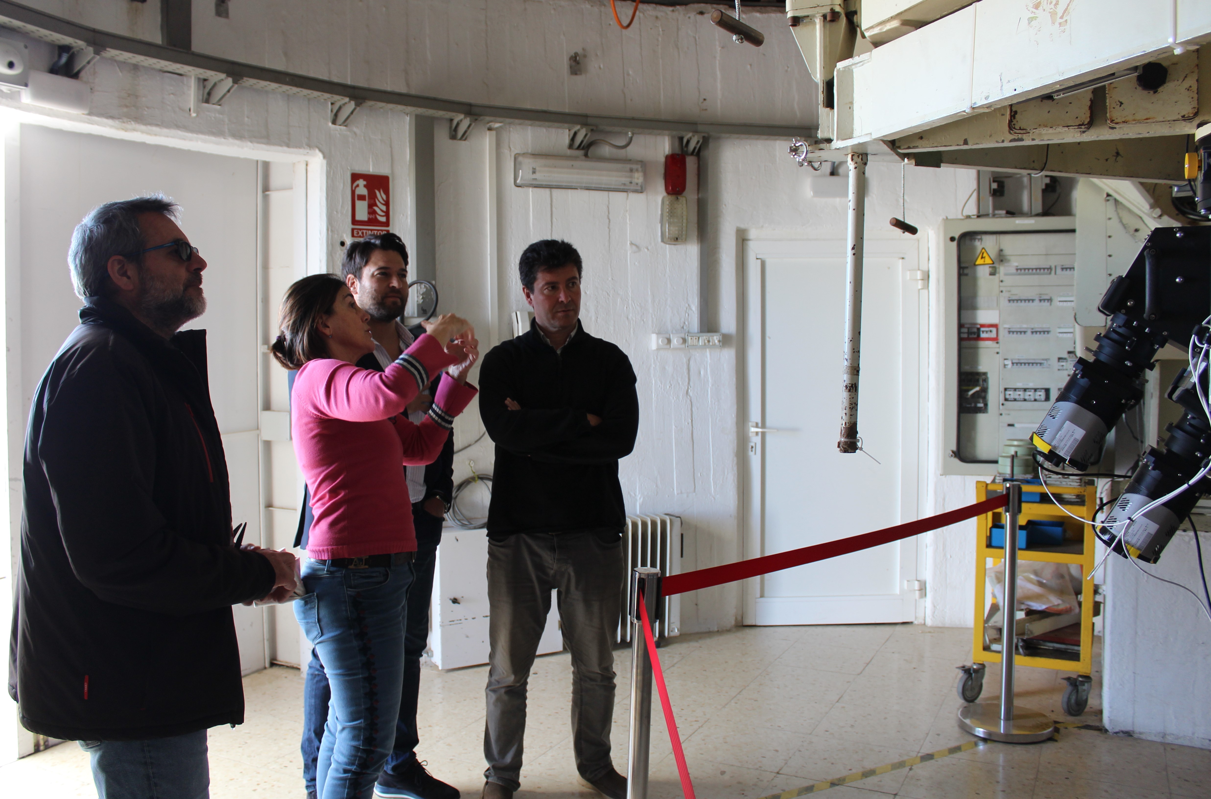 Interior de la cúpula del Telescopio Carlos Sánchez. De izquierda a derecha: Miquel Serra-Ricart, administrador del Observatorio del Teide; Casiana Muñoz-Tuñón, subdirectora del IAC; Airam Puerta, alcalde de Güímar; y Antonio Maudes; responsable de asuntos económicos y jurídicos de IACTEC, el 3/3/2020.