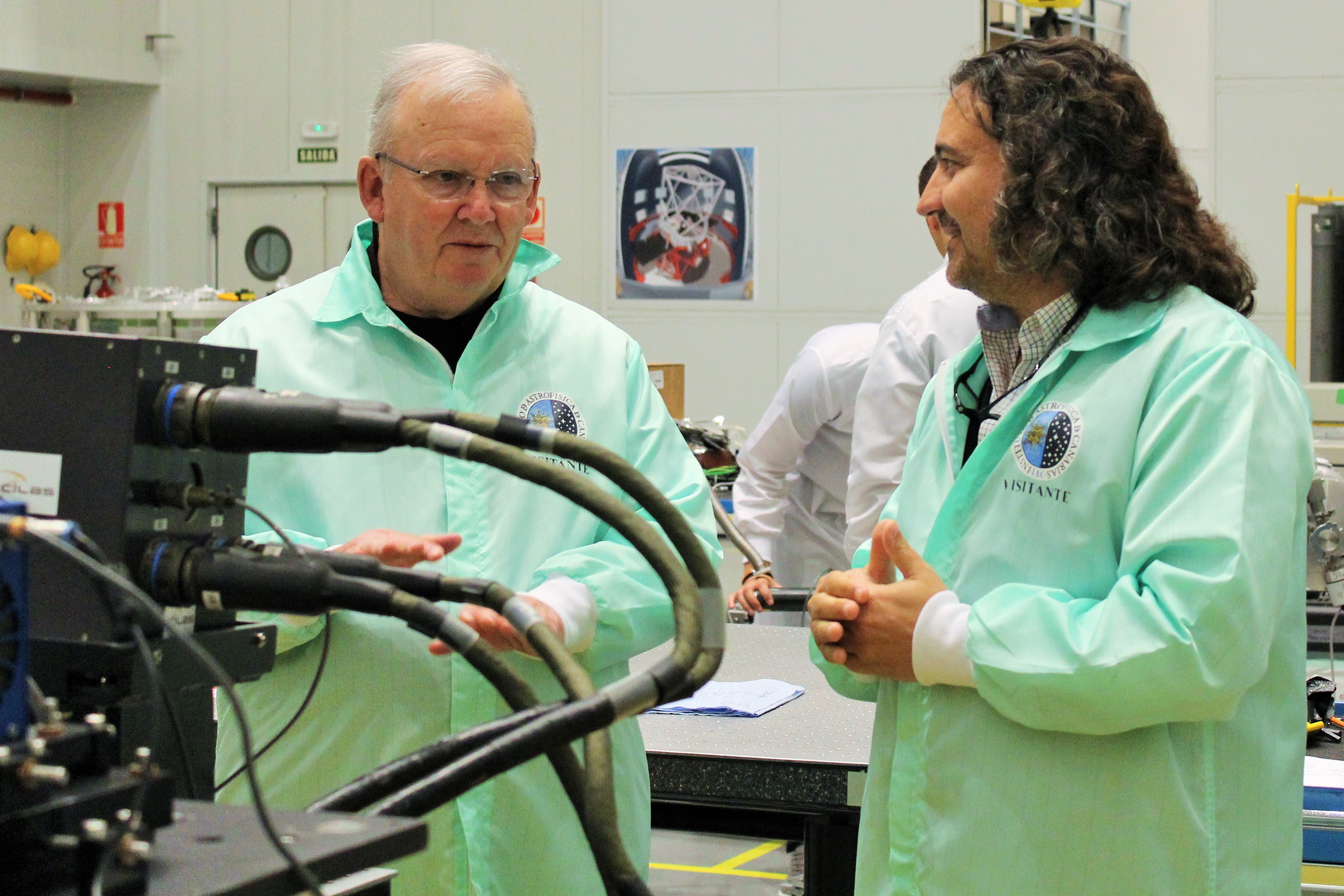 Wayne Rosing y Alfonso López Aguerri, ambos con bata verde de visitante, dentro de la sala de Armado, Integración y Verificación de grandes instrumentos, ubicada en la sede central del IAC en La Laguna. Detrás de ellos están trabajando dos ingenieros con bata blanca. Crédito: Alejandra Rueda Moral (IAC).