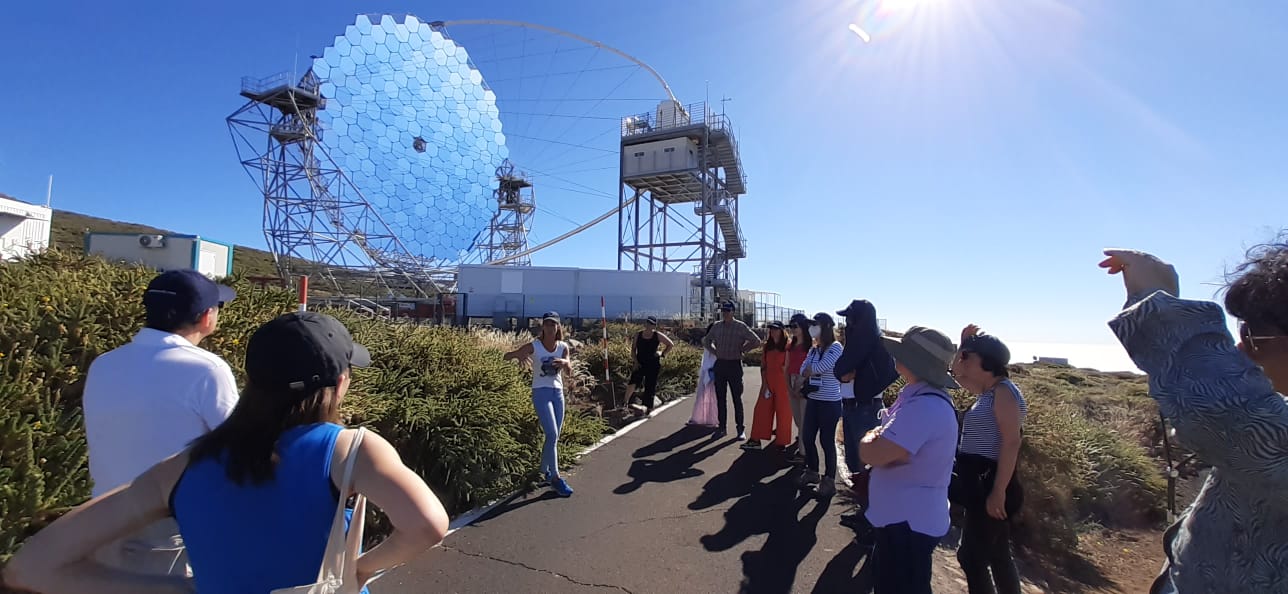 Participantes del curso AEACI 2022 frente al telescopio LST-1 de la red CTA, en el Observatorio del Roque de los Muchachos (ORM).