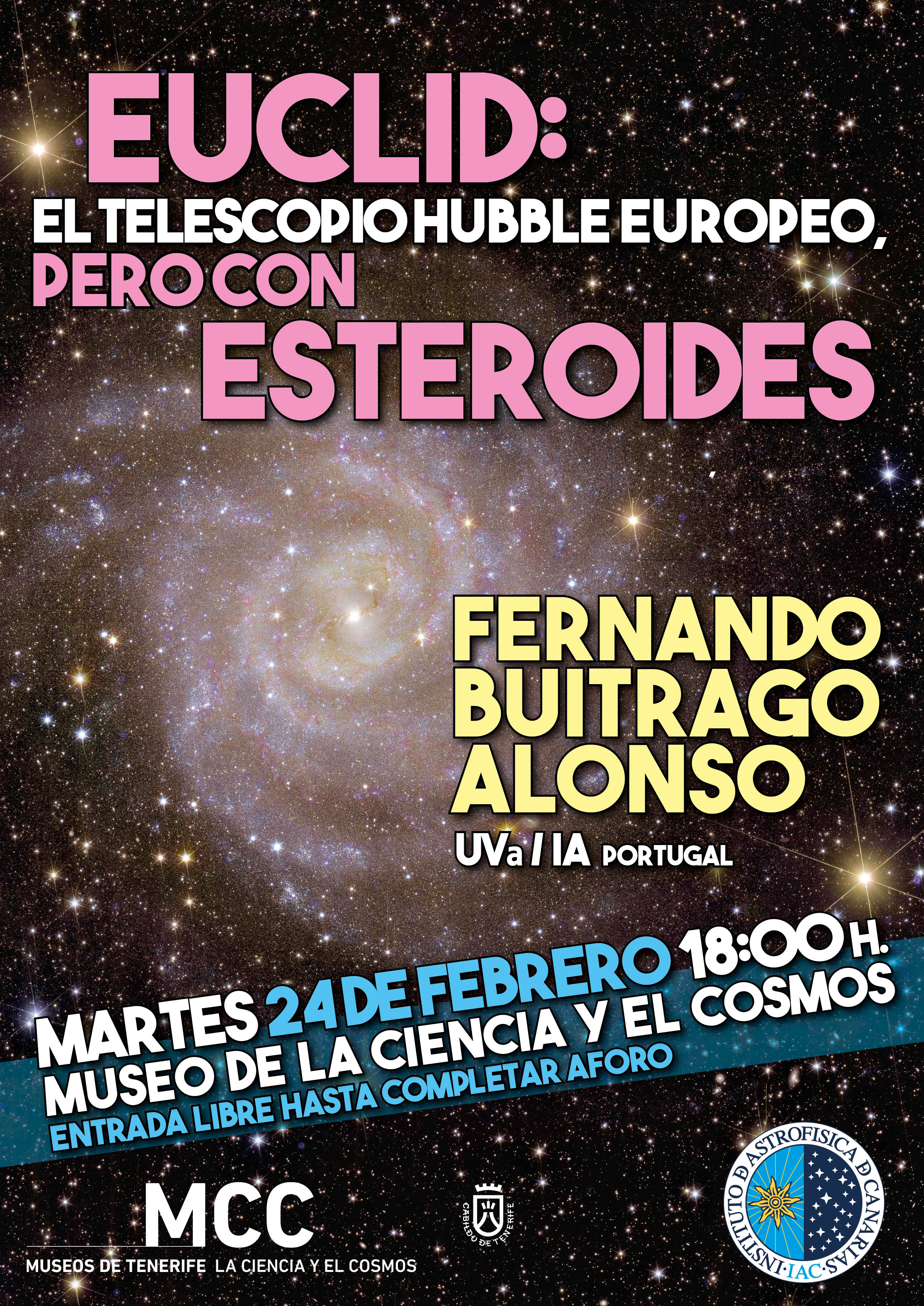 Bajo el título "Euclid: el telescopio Hubble europeo, pero con esteroides", Buitrago explicará por qué, aunque Euclid no sea tan grande ni tan famoso como el Hubble, “está llamado a revolucionar la Astronomía”, en sus propias palabras. Desde su posición a 1,5 millones de kilómetros de la Tierra, este telescopio de la Agencia Espacial Europea (ESA) está creando el mapa 3D más preciso del Universo para resolver el mayor enigma de la ciencia actual: ¿qué son la materia y la energía oscura?